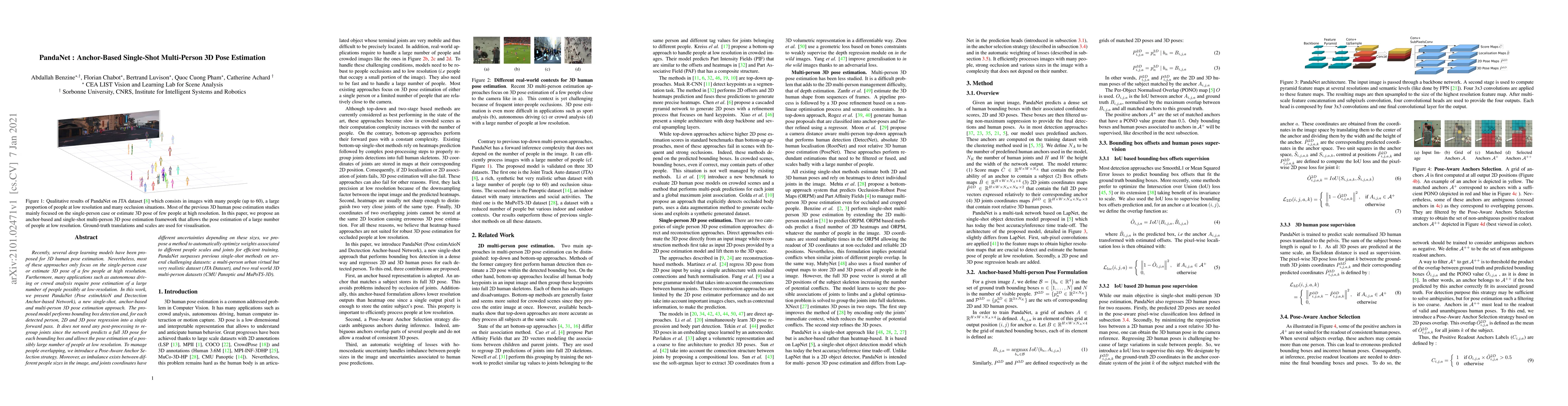 PandaNet is an anchor-based, single-shot model for multi-person 3D pose estimation that performs bounding box detection and 2D/3D pose regression in one pass. It optimizes weights for different people scales and joints, enabling efficient estimation of numerous people at low resolution.