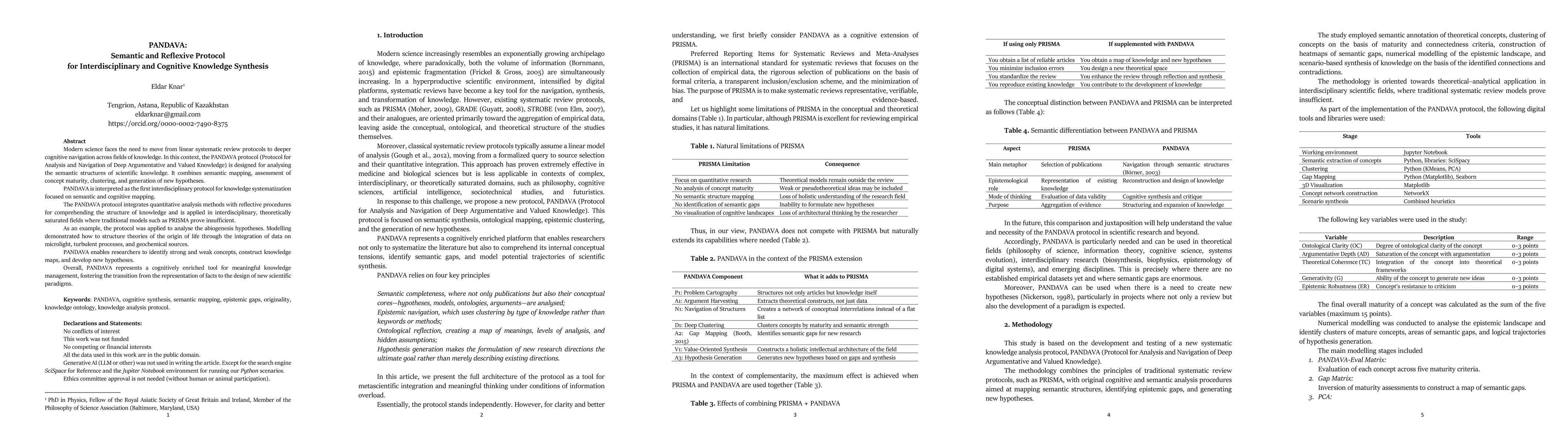 Modern science faces the need to move from linear systematic review protocols to deeper cognitive navigation across fields of knowledge. In this context, the PANDAVA protocol (Protocol for Analysis and Navigation of Deep Argumentative and Valued Knowledge) is designed for analysing the semantic structures of scientific knowledge. It combines semantic mapping, assessment of concept maturity, clustering, and generation of new hypotheses. PANDAVA is interpreted as the first interdisciplinary protocol for knowledge systematization focused on semantic and cognitive mapping. The PANDAVA protocol integrates quantitative analysis methods with reflective procedures for comprehending the structure of knowledge and is applied in interdisciplinary, theoretically saturated fields where traditional models such as PRISMA prove insufficient. As an example, the protocol was applied to analyse the abiogenesis hypotheses. Modelling demonstrated how to structure theories of the origin of life through the integration of data on microlight, turbulent processes, and geochemical sources. PANDAVA enables researchers to identify strong and weak concepts, construct knowledge maps, and develop new hypotheses. Overall, PANDAVA represents a cognitively enriched tool for meaningful knowledge management, fostering the transition from the representation of facts to the design of new scientific paradigms.
