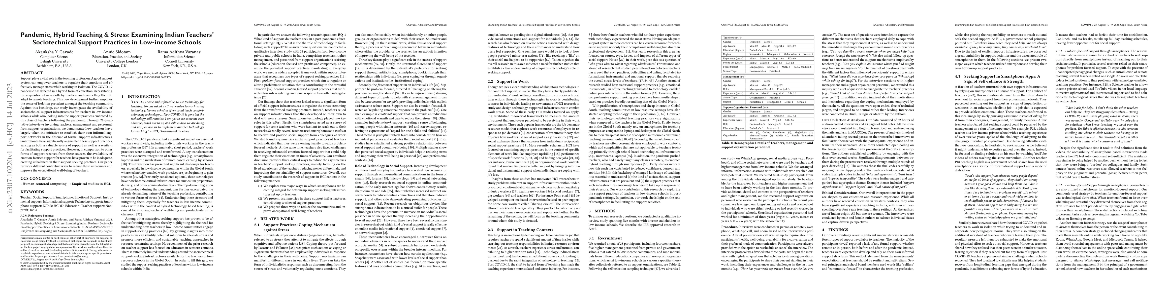 This study explores the sociotechnical support practices of Indian teachers in low-income schools during the COVID-19 pandemic, revealing that they have formed informal support networks due to the lack of formal infrastructure. Smartphones play a crucial role in these networks, though the availability of emotion-focused support remains inadequate, highlighting the need for improved support systems to enhance teachers' occupational well-being.