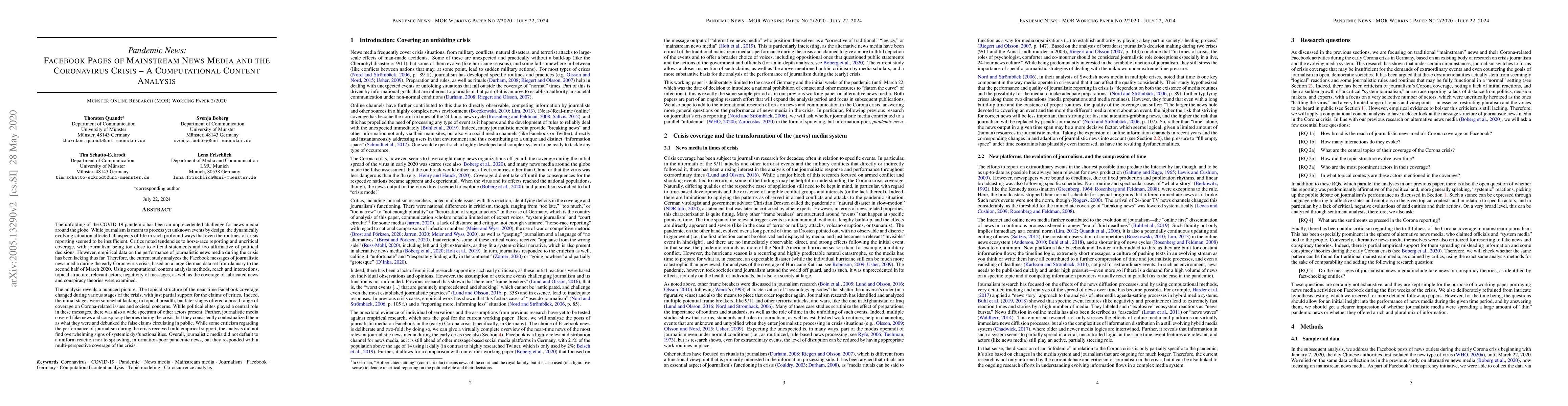 The unfolding of the COVID-19 pandemic has been an unprecedented challenge for news media around the globe. While journalism is meant to process yet unknown events by design, the dynamically evolving situation affected all aspects of life in such profound ways that even the routines of crisis reporting seemed to be insufficient. Critics noted tendencies to horse-race reporting and uncritical coverage, with journalism being too close to official statements and too affirmative of political decisions. However, empirical data on the performance of journalistic news media during the crisis has been lacking thus far. The current study analyzes the Facebook messages of journalistic news media during the early Coronavirus crisis, based on a large German data set from January to March 2020. Using computational content analysis methods, reach and interactions, topical structure, relevant actors, negativity of messages, as well as the coverage of fabricated news and conspiracy theories were examined. The topical structure of the near-time Facebook coverage changed during various stages of the crisis, with just partial support for the claims of critics. The initial stages were somewhat lacking in topical breadth, but later stages offered a broad range of coverage on Corona-related issues and societal concerns. Further, journalistic media covered fake news and conspiracy theories during the crisis, but they consistently contextualized them as what they were and debunked the false claims circulating in public. While some criticism regarding the performance of journalism during the crisis received mild empirical support, the analysis did not find overwhelming signs of systemic dysfunctionalities. Overall, journalistic media did not default to a uniform reaction nor to sprawling, information-poor pandemic news, but they responded with a multi-perspective coverage of the crisis.