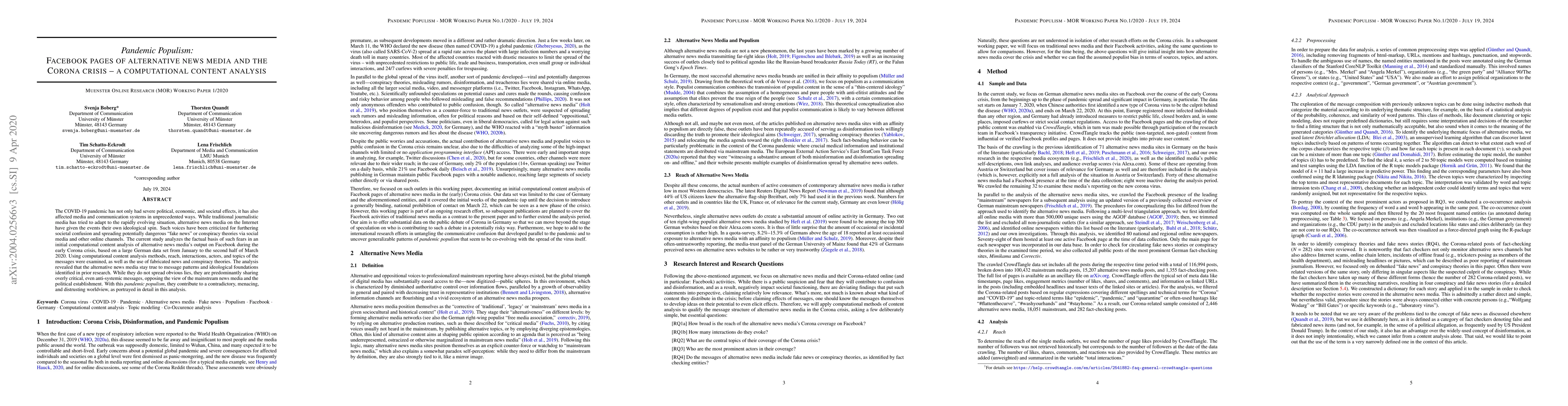 The study examines the content of alternative news media on Facebook during the early COVID-19 crisis, revealing that these sources predominantly spread overly critical, anti-systemic messages, contributing to a distrusting worldview despite not spreading obvious lies. The analysis highlights the ideological patterns and the use of conspiracy theories in these narratives.