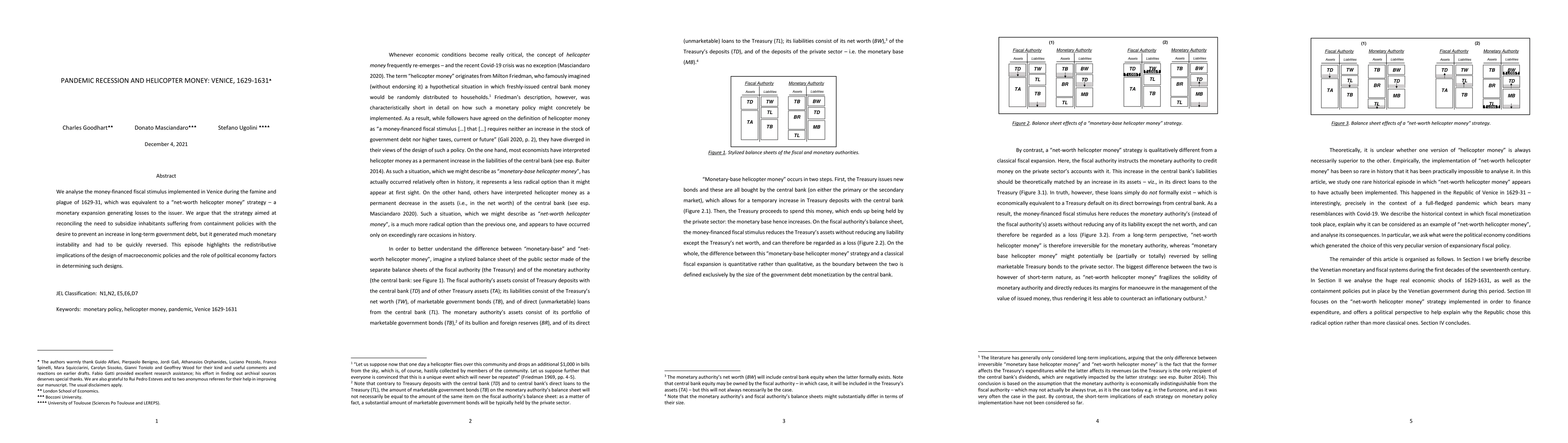 We analyse the money-financed fiscal stimulus implemented in Venice during the famine and plague of 1629--31, which was equivalent to a 'net-worth helicopter money' strategy -- a monetary expansion generating losses to the issuer. We argue that the strategy aimed at reconciling the need to subsidize inhabitants suffering from containment policies with the desire to prevent an increase in long-term government debt, but it generated much monetary instability and had to be quickly reversed. This episode highlights the redistributive implications of the design of macroeconomic policies and the role of political economy factors in determining such designs.
