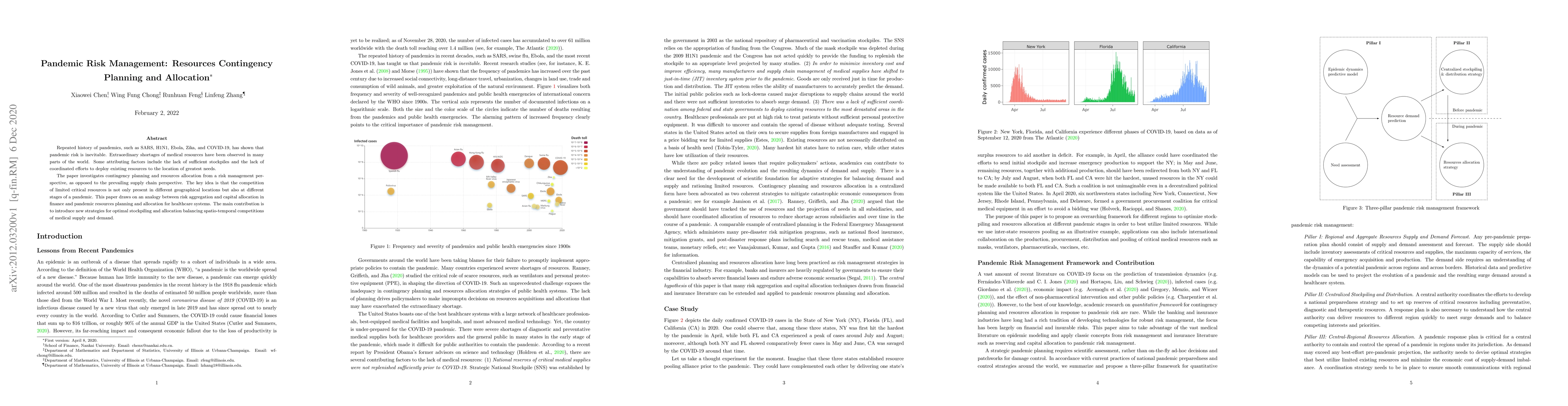 This paper explores pandemic risk management through contingency planning and resource allocation, emphasizing strategies for optimal stockpiling and distribution of limited medical resources. It introduces novel approaches by drawing parallels between financial capital allocation and healthcare resource management, aiming to better balance spatio-temporal supply and demand during pandemics.