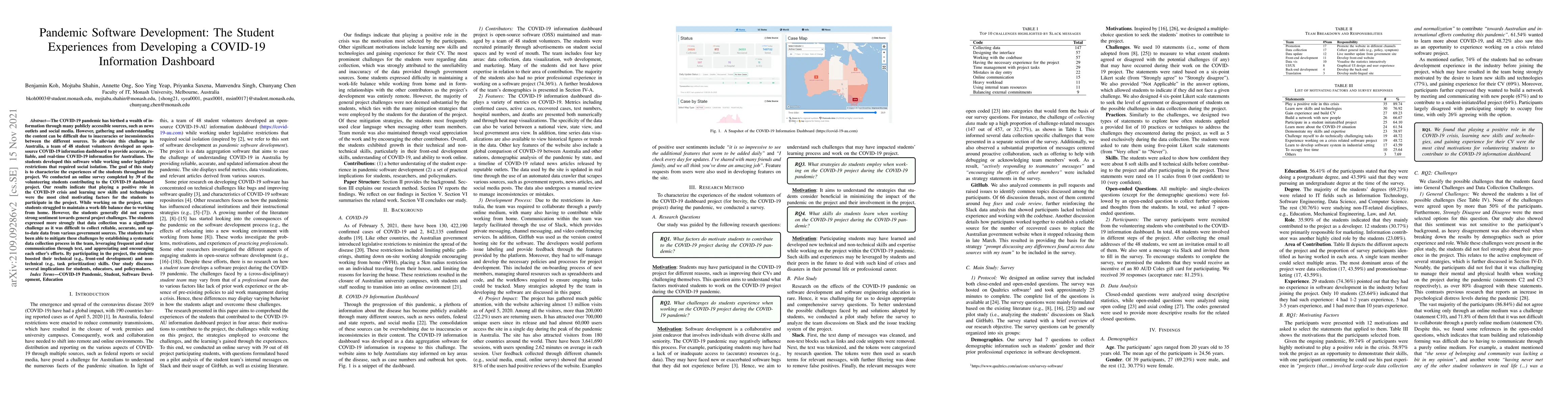 This study explores the experiences of 39 student volunteers who developed an open-source COVID-19 information dashboard in Australia, highlighting their motivations, challenges, and skill development. The students cited learning new skills and contributing positively to the pandemic response as key motivators, while data collection posed significant challenges.