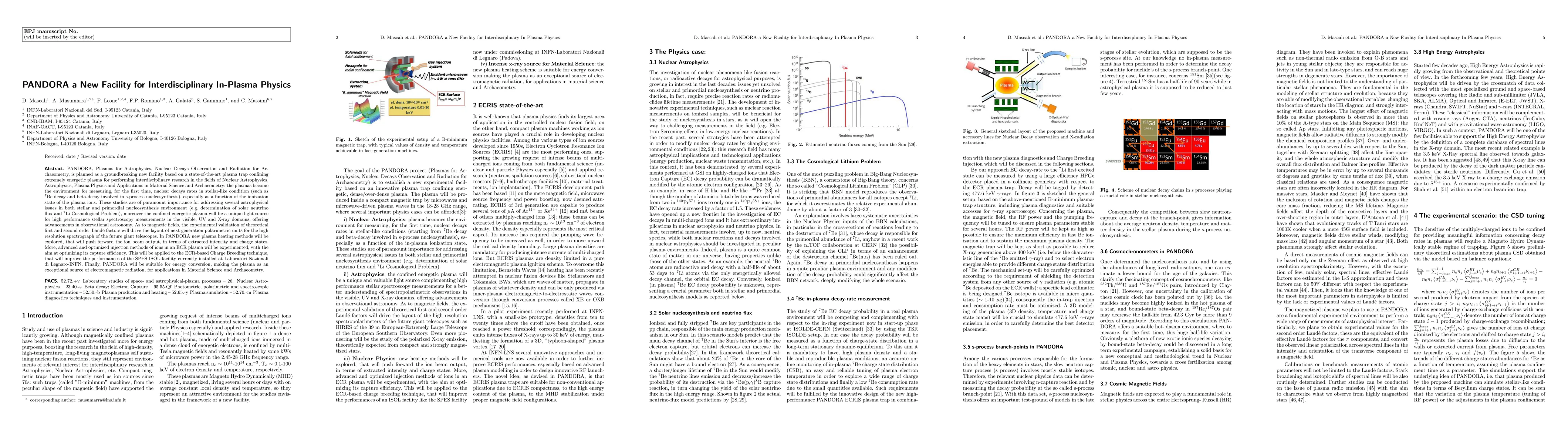 PANDORA, Plasmas for Astrophysics, Nuclear Decays Observation and Radiation for Archaeometry, is planned as a new facility based on a state-of-the-art plasma trap confining energetic plasma for performing interdisciplinary research in the fields of Nuclear Astrophysics, Astrophysics, Plasma Physics and Applications in Material Science and Archaeometry: the plasmas become the environment for measuring nuclear decays rates in stellar-like condition (such as 7Be decay and beta-decay involved in s-process nucleosynthesis), especially as a function of the ionization state of the plasma ions. These studies are of paramount importance for addressing several astrophysical issues in both stellar and primordial nucleosynthesis environment (e.g. determination of solar neutrino flux and 7Li Cosmological Problem), moreover the confined energetic plasma will be a unique light source for high performance stellar spectroscopy measurements in the visible, UV and X-ray domains, offering advancements in observational astronomy. As to magnetic fields, the experimental validation of theoretical first and second order Land\'e factors will drive the layout of next generation polarimetric units for the high resolution spectrograph of the future giant telescopes. In PANDORA new plasma heating methods will be explored, that will push forward the ion beam output, in terms of extracted intensity and charge states. More, advanced and optimized injection methods of ions in an ECR plasma will be experimented, with the aim at optimizing its capture efficiency. This will be applied to the ECR-based Charge Breeding technique, that will improve the performances of the SPES ISOL-facility currently installed at Laboratori Nazionali di Legnaro-INFN. Finally, PANDORA will be suitable for energy conversion, making the plasma as a source of electromagnetic radiation, for applications in Material Science and Archaeometry.