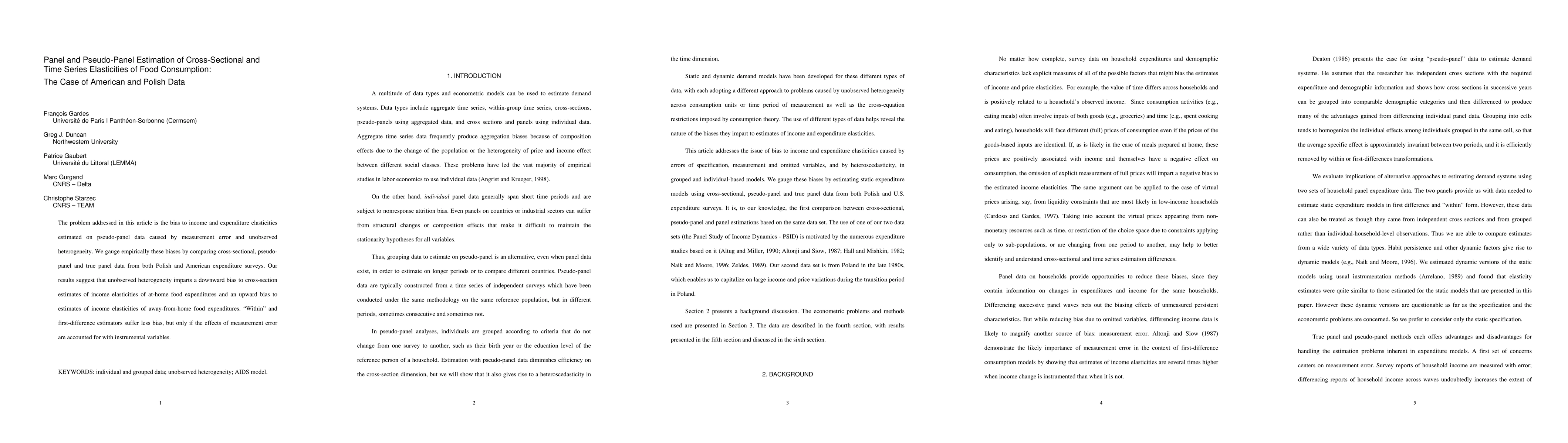The problem addressed in this article is the bias to income and expenditure elasticities estimated on pseudo-panel data caused by measurement error and unobserved heterogeneity. We gauge empirically these biases by comparing cross-sectional, pseudo-panel and true panel data from both Polish and American expenditure surveys. Our results suggest that unobserved heterogeneity imparts a downward bias to cross-section estimates of income elasticities of at-home food expenditures and an upward bias to estimates of income elasticities of away-from-home food expenditures. "Within" and first-difference estimators suffer less bias, but only if the effects of measurement error are accounted for with instrumental variables.