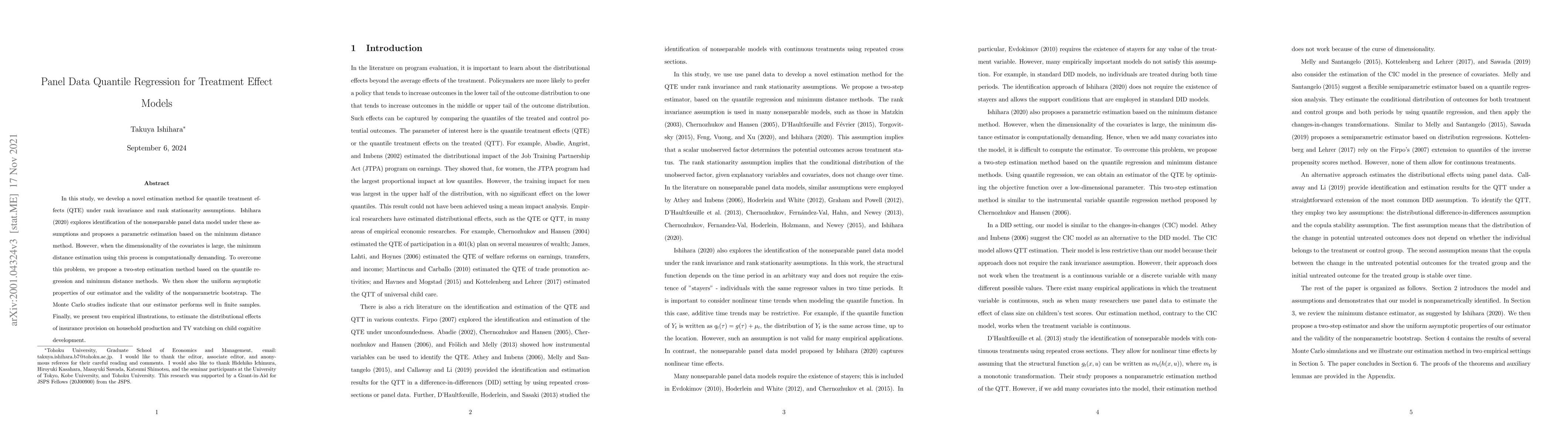 This paper introduces a two-step estimation method for quantile treatment effects using panel data quantile regression and minimum distance methods, addressing computational challenges in high-dimensional settings. The proposed method is shown to perform well in Monte Carlo simulations and is applied to estimate the effects of insurance and TV watching on household and child outcomes, respectively.