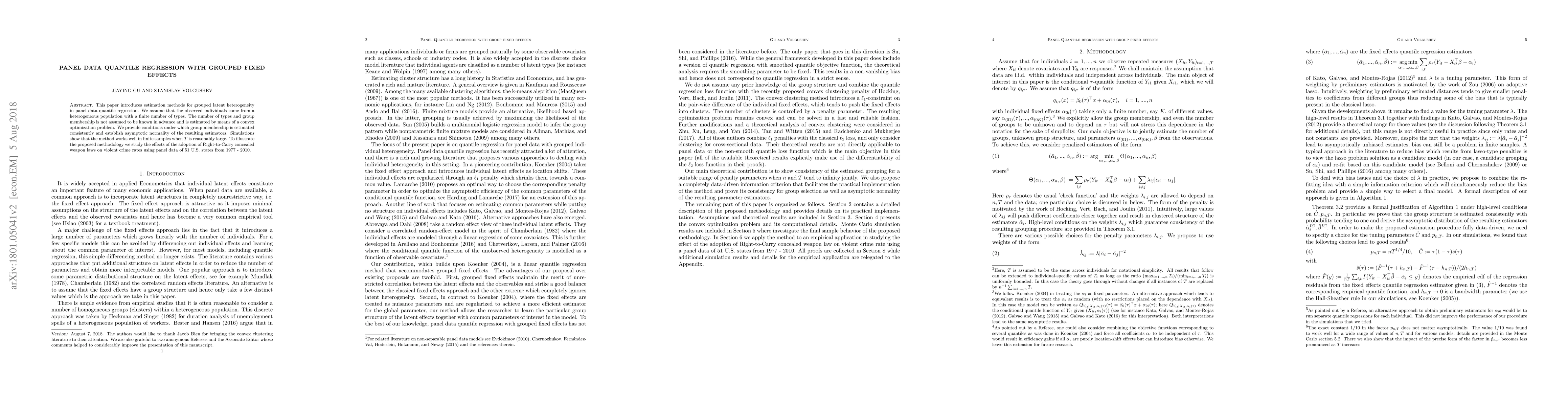 This paper develops estimation methods for grouped latent heterogeneity in panel data quantile regression, estimating group membership through a convex optimization problem. The proposed method is shown to work well in finite samples and is applied to study the impact of concealed weapon laws on violent crime rates across U.S. states.