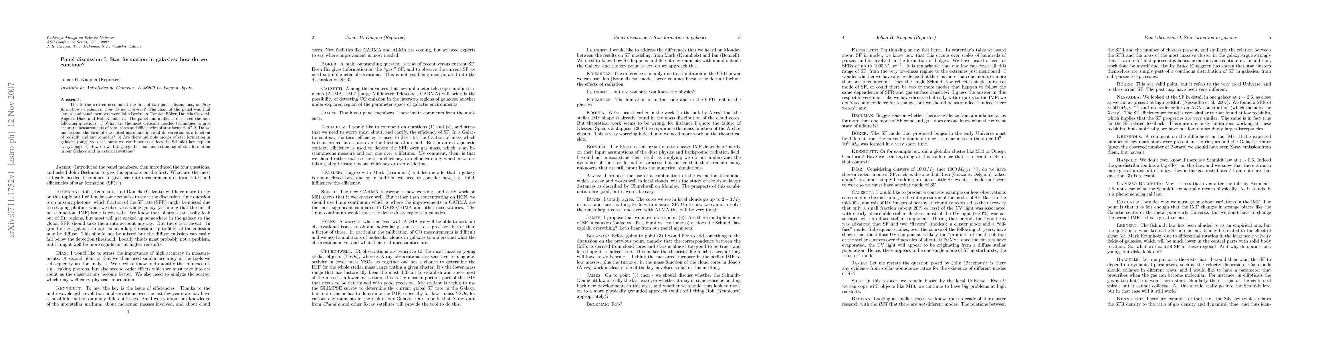 This is the written account of the first of two panel discussions, on "Star formation in galaxies: how do we continue?" The chair of the panel was Phil James, and panel members were John Beckman, Torsten Boeker, Daniela Calzetti, Angeles Diaz, and Rob Kennicutt. The panel and audience discussed the four following questions: 1) What are the most critically needed techniques to give accurate measurements of total rates and efficiencies of star formation? 2) Do we understand the form of the initial mass function and its variation as a function of redshift and environment? 3) Are there multiple modes of star formation in galaxies (bulge vs. disk, burst vs. continuous) or does the Schmidt law explain everything? 4) How do we bring together our understanding of star formation in our Galaxy and in external systems?