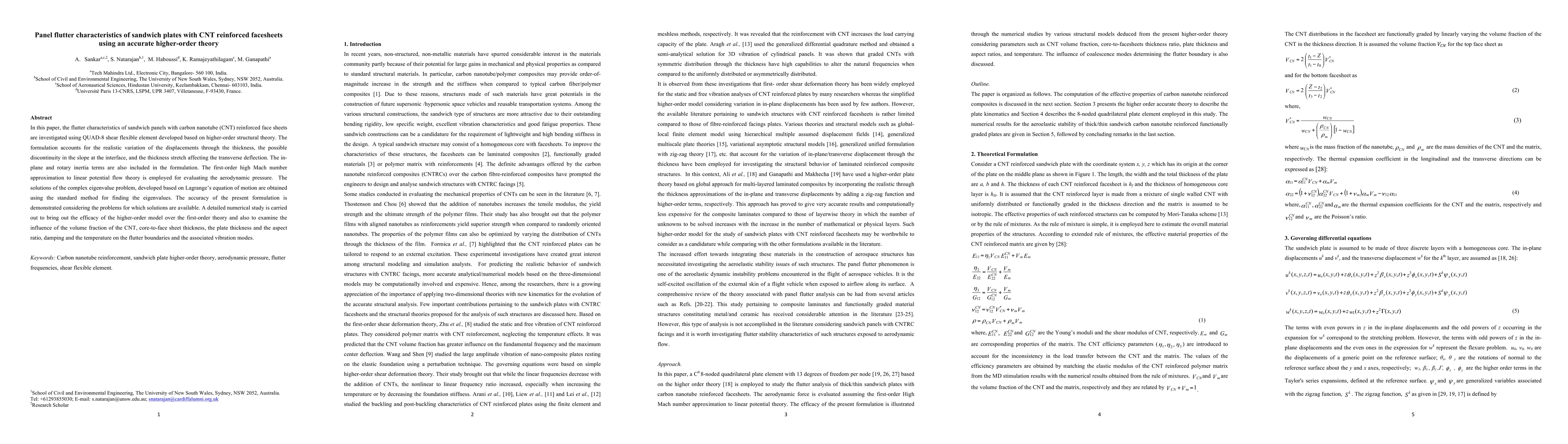 The research investigates the flutter characteristics of sandwich panels with CNT reinforced face sheets using an accurate higher-order theory, QUAD-8 shear flexible element, accounting for displacement variation, interface discontinuity, thickness stretch, in-plane and rotary inertia, and employing high Mach number approximation to linear potential flow theory.
