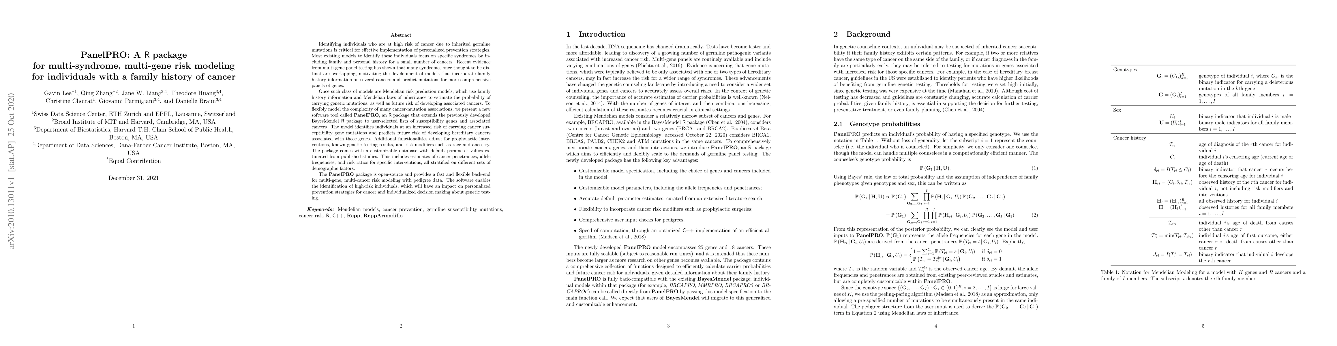 Identifying individuals who are at high risk of cancer due to inherited germline mutations is critical for effective implementation of personalized prevention strategies. Most existing models to identify these individuals focus on specific syndromes by including family and personal history for a small number of cancers. Recent evidence from multi-gene panel testing has shown that many syndromes once thought to be distinct are overlapping, motivating the development of models that incorporate family history information on several cancers and predict mutations for more comprehensive panels of genes. Once such class of models are Mendelian risk prediction models, which use family history information and Mendelian laws of inheritance to estimate the probability of carrying genetic mutations, as well as future risk of developing associated cancers. To flexibly model the complexity of many cancer-mutation associations, we present a new software tool called PanelPRO, a R package that extends the previously developed BayesMendel R package to user-selected lists of susceptibility genes and associated cancers. The model identifies individuals at an increased risk of carrying cancer susceptibility gene mutations and predicts future risk of developing hereditary cancers associated with those genes. Additional functionalities adjust for prophylactic interventions, known genetic testing results, and risk modifiers such as race and ancestry. The package comes with a customizable database with default parameter values estimated from published studies. The PanelPRO package is open-source and provides a fast and flexible back-end for multi-gene, multi-cancer risk modeling with pedigree data. The software enables the identification of high-risk individuals, which will have an impact on personalized prevention strategies for cancer and individualized decision making about genetic testing.