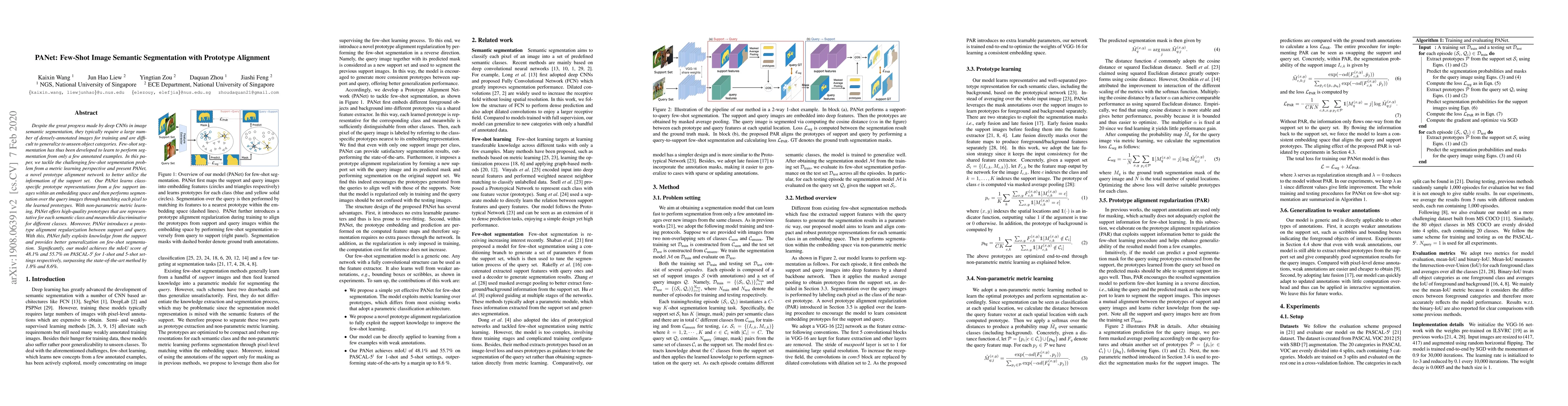 PANet introduces a prototype alignment network for few-shot image semantic segmentation, leveraging metric learning to create class-specific prototypes from limited support images, achieving state-of-the-art performance with mIoU scores of 48.1% and 55.7% on PASCAL-5i for 1-shot and 5-shot settings respectively.