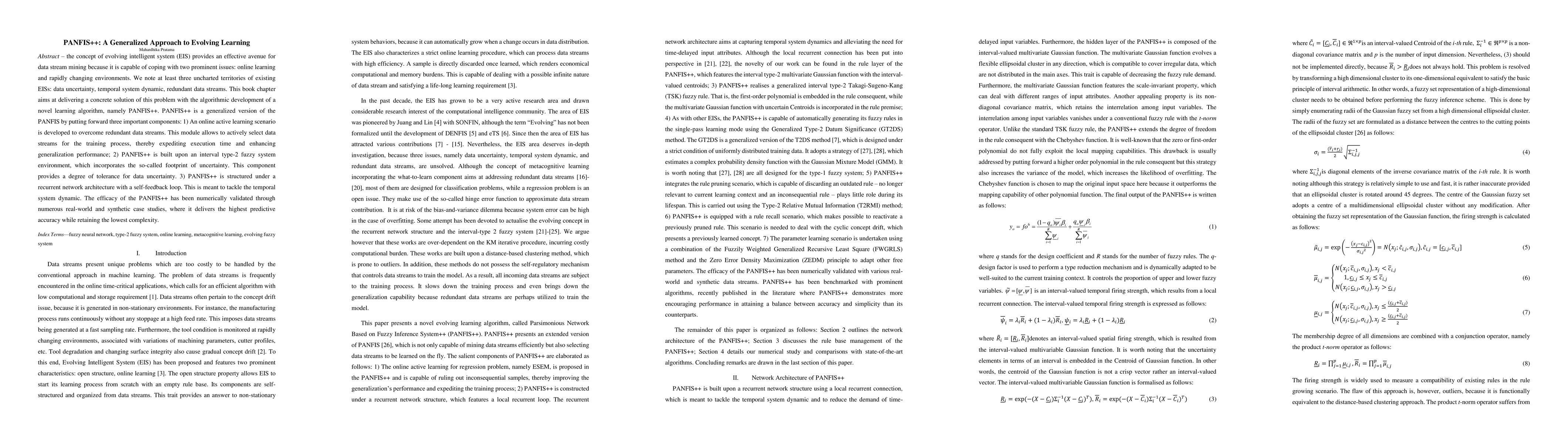 The concept of evolving intelligent system (EIS) provides an effective avenue for data stream mining because it is capable of coping with two prominent issues: online learning and rapidly changing environments. We note at least three uncharted territories of existing EISs: data uncertainty, temporal system dynamic, redundant data streams. This book chapter aims at delivering a concrete solution of this problem with the algorithmic development of a novel learning algorithm, namely PANFIS++. PANFIS++ is a generalized version of the PANFIS by putting forward three important components: 1) An online active learning scenario is developed to overcome redundant data streams. This module allows to actively select data streams for the training process, thereby expediting execution time and enhancing generalization performance, 2) PANFIS++ is built upon an interval type-2 fuzzy system environment, which incorporates the so-called footprint of uncertainty. This component provides a degree of tolerance for data uncertainty. 3) PANFIS++ is structured under a recurrent network architecture with a self-feedback loop. This is meant to tackle the temporal system dynamic. The efficacy of the PANFIS++ has been numerically validated through numerous real-world and synthetic case studies, where it delivers the highest predictive accuracy while retaining the lowest complexity.