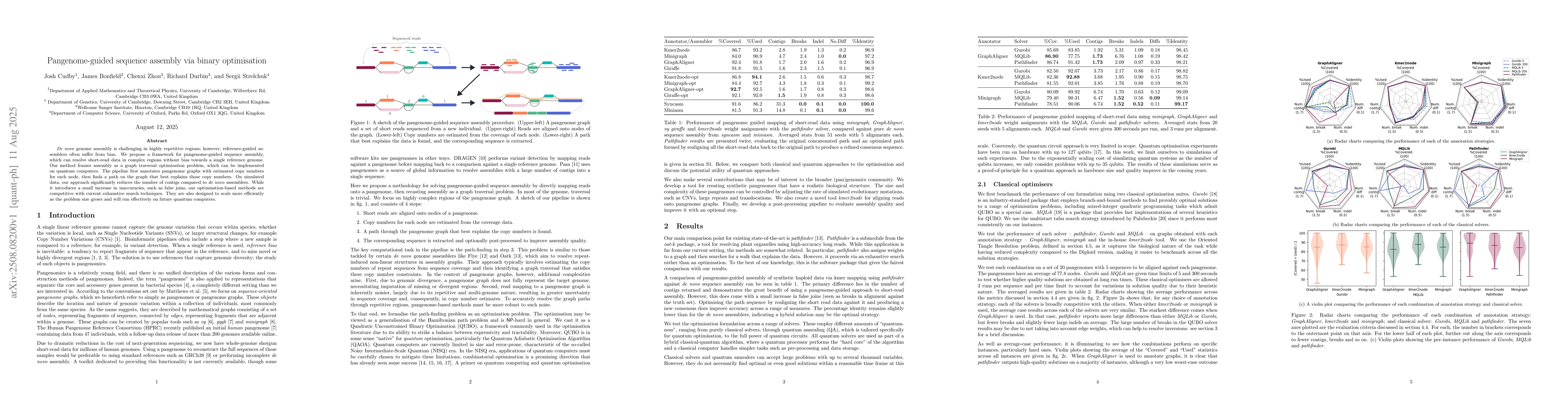 De novo genome assembly is challenging in highly repetitive regions; however, reference-guided assemblers often suffer from bias. We propose a framework for pangenome-guided sequence assembly, which can resolve short-read data in complex regions without bias towards a single reference genome. Our method frames assembly as a graph traversal optimisation problem, which can be implemented on quantum computers. The pipeline first annotates pangenome graphs with estimated copy numbers for each node, then finds a path on the graph that best explains those copy numbers. On simulated data, our approach significantly reduces the number of contigs compared to de novo assemblers. While it introduces a small increase in inaccuracies, such as false joins, our optimisation-based methods are competitive with current exhaustive search techniques. They are also designed to scale more efficiently as the problem size grows and will run effectively on future quantum computers.
