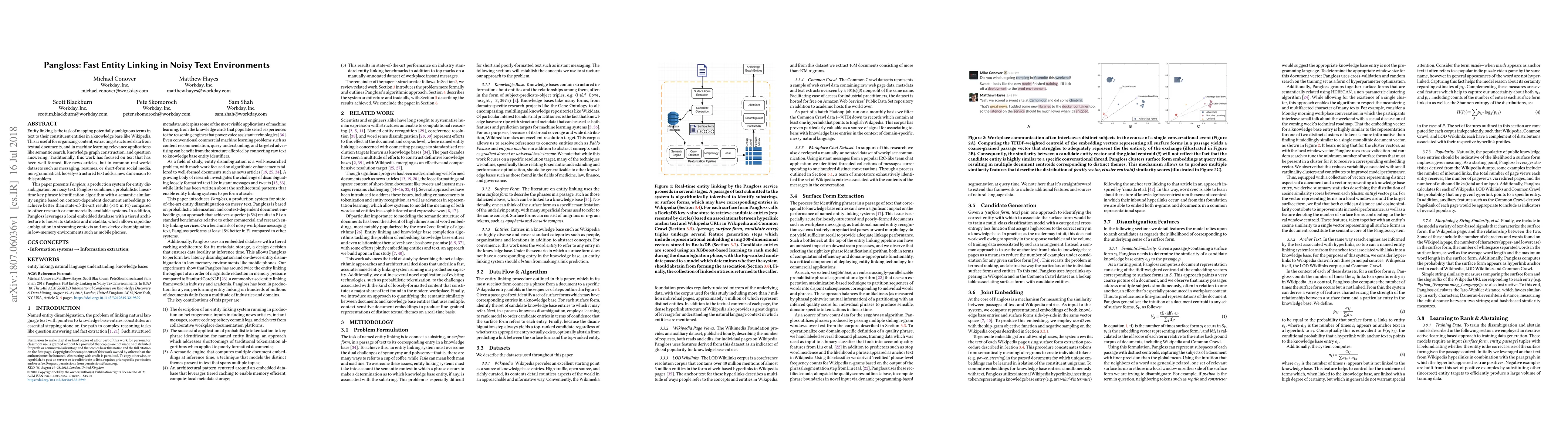 Pangloss is a system designed for fast entity linking in noisy text environments, combining a linear-time key phrase identification algorithm with context-dependent document embeddings for improved accuracy. It outperforms existing methods by over 5% in F1 score and supports rapid disambiguation in streaming and low-memory contexts.