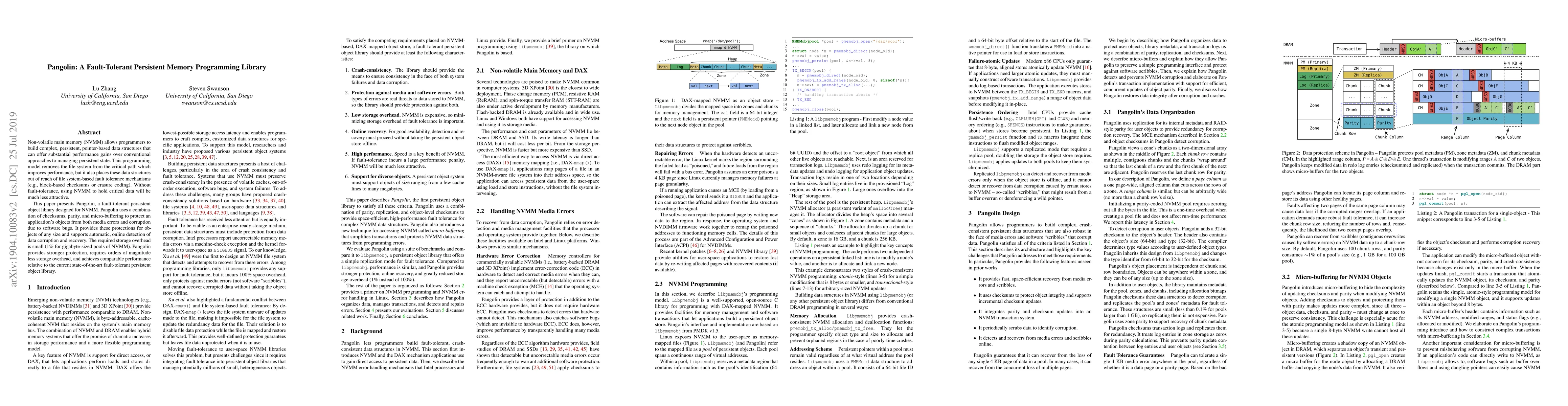 Pangolin is a fault-tolerant persistent memory programming library that leverages non-volatile main memory (NVMM) to enhance performance. It integrates checksums, parity, and micro-buffering to ensure robust protection against data corruption with minimal storage overhead.