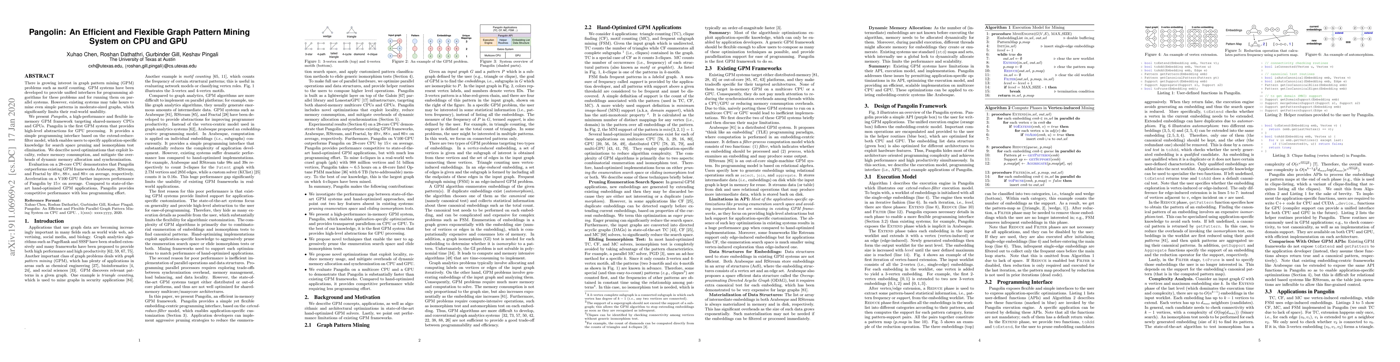 Pangolin is a high-performance graph pattern mining system for CPUs and GPUs, offering a flexible, high-level abstraction for parallel processing. It significantly outperforms existing frameworks and provides competitive performance with less programming effort.