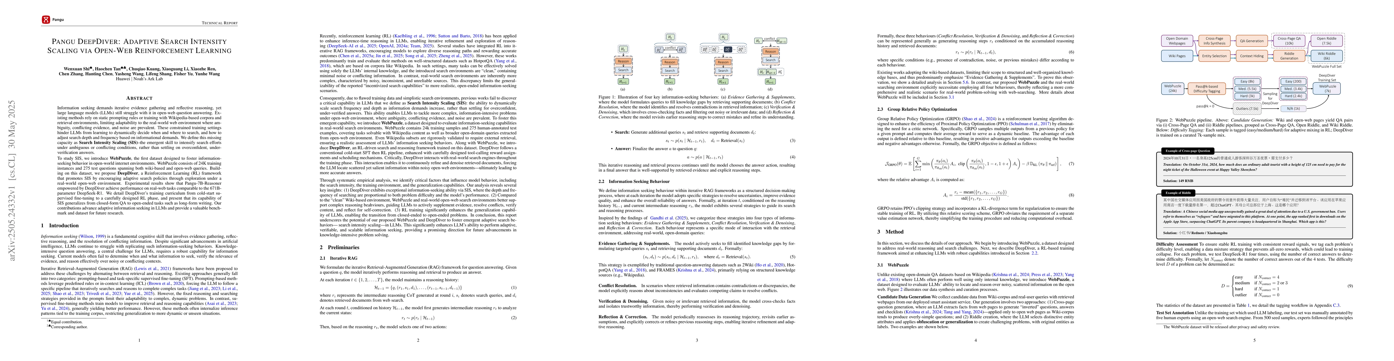 Information seeking demands iterative evidence gathering and reflective reasoning, yet large language models (LLMs) still struggle with it in open-web question answering. Existing methods rely on static prompting rules or training with Wikipedia-based corpora and retrieval environments, limiting adaptability to the real-world web environment where ambiguity, conflicting evidence, and noise are prevalent. These constrained training settings hinder LLMs from learning to dynamically decide when and where to search, and how to adjust search depth and frequency based on informational demands. We define this missing capacity as Search Intensity Scaling (SIS)--the emergent skill to intensify search efforts under ambiguous or conflicting conditions, rather than settling on overconfident, under-verification answers. To study SIS, we introduce WebPuzzle, the first dataset designed to foster information-seeking behavior in open-world internet environments. WebPuzzle consists of 24K training instances and 275 test questions spanning both wiki-based and open-web queries. Building on this dataset, we propose DeepDiver, a Reinforcement Learning (RL) framework that promotes SIS by encouraging adaptive search policies through exploration under a real-world open-web environment. Experimental results show that Pangu-7B-Reasoner empowered by DeepDiver achieve performance on real-web tasks comparable to the 671B-parameter DeepSeek-R1. We detail DeepDiver's training curriculum from cold-start supervised fine-tuning to a carefully designed RL phase, and present that its capability of SIS generalizes from closed-form QA to open-ended tasks such as long-form writing. Our contributions advance adaptive information seeking in LLMs and provide a valuable benchmark and dataset for future research.
