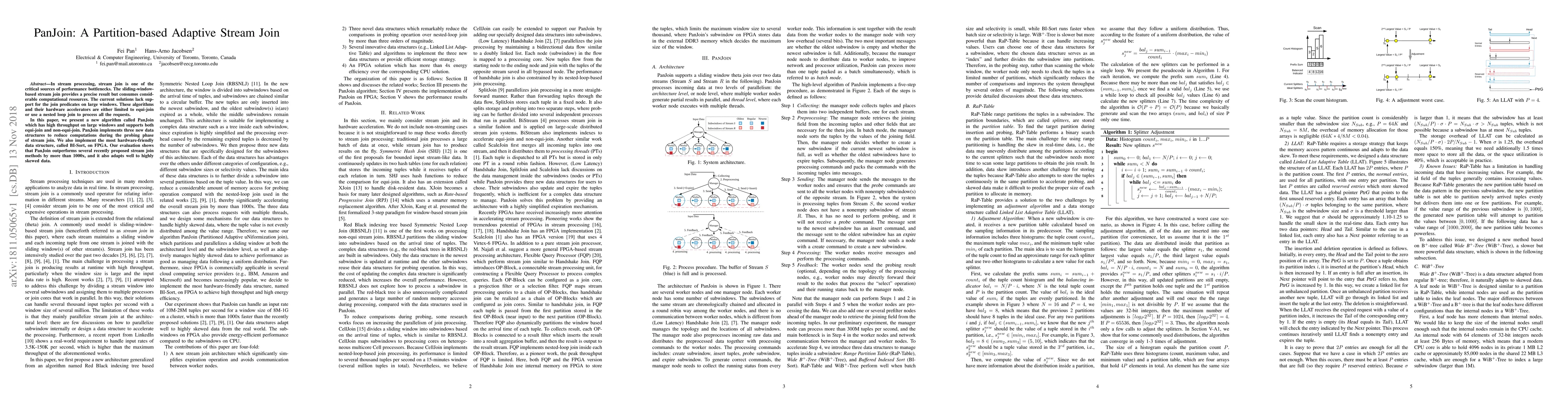 PanJoin introduces a partition-based adaptive stream join algorithm that significantly enhances throughput for large windows, supporting both equi-join and non-equi-join predicates. It outperforms existing methods by over 1000x and effectively handles skewed data.