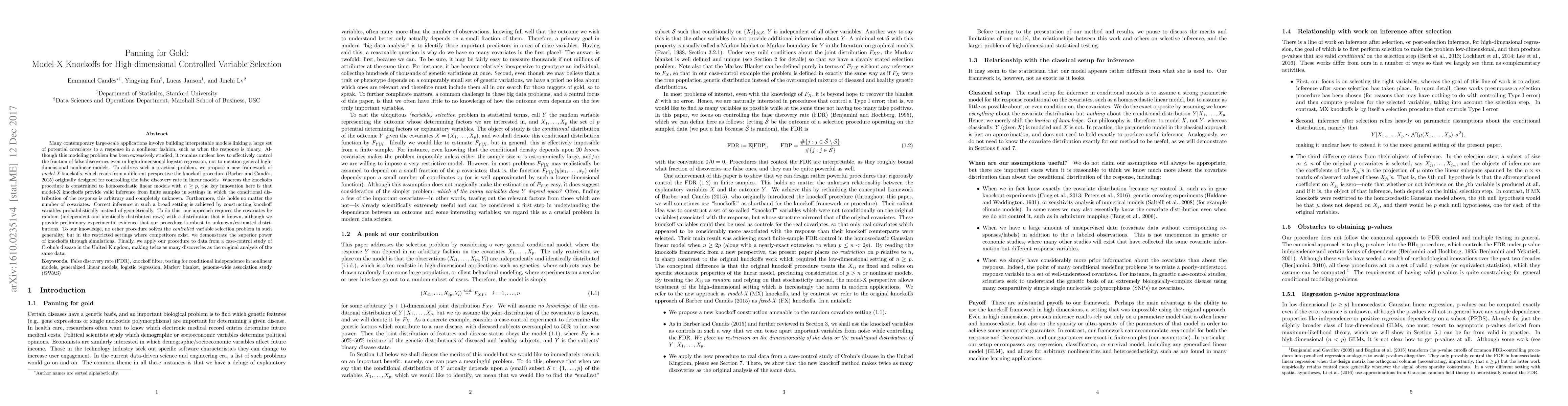 Many contemporary large-scale applications involve building interpretable models linking a large set of potential covariates to a response in a nonlinear fashion, such as when the response is binary. Although this modeling problem has been extensively studied, it remains unclear how to effectively control the fraction of false discoveries even in high-dimensional logistic regression, not to mention general high-dimensional nonlinear models. To address such a practical problem, we propose a new framework of $model$-$X$ knockoffs, which reads from a different perspective the knockoff procedure (Barber and Cand\`es, 2015) originally designed for controlling the false discovery rate in linear models. Whereas the knockoffs procedure is constrained to homoscedastic linear models with $n\ge p$, the key innovation here is that model-X knockoffs provide valid inference from finite samples in settings in which the conditional distribution of the response is arbitrary and completely unknown. Furthermore, this holds no matter the number of covariates. Correct inference in such a broad setting is achieved by constructing knockoff variables probabilistically instead of geometrically. To do this, our approach requires the covariates be random (independent and identically distributed rows) with a distribution that is known, although we provide preliminary experimental evidence that our procedure is robust to unknown/estimated distributions. To our knowledge, no other procedure solves the $controlled$ variable selection problem in such generality, but in the restricted settings where competitors exist, we demonstrate the superior power of knockoffs through simulations. Finally, we apply our procedure to data from a case-control study of Crohn's disease in the United Kingdom, making twice as many discoveries as the original analysis of the same data.