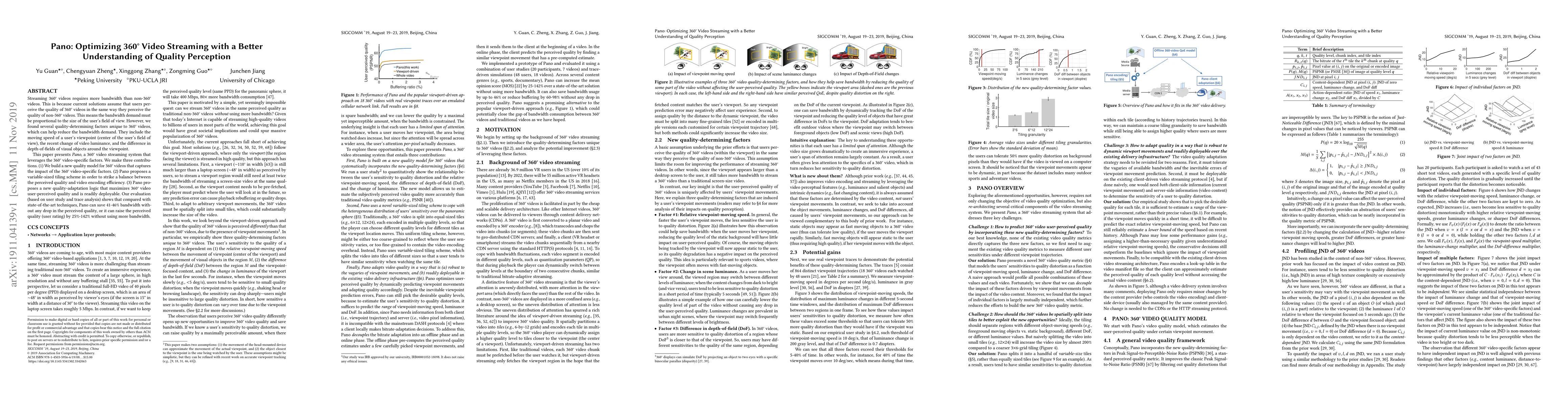 Pano optimizes 360° video streaming by developing a quality model that considers unique 360° video factors, including viewpoint movement and luminance changes. It achieves bandwidth savings of 41-46% or improves perceived quality by 25%-142% without increasing bandwidth.