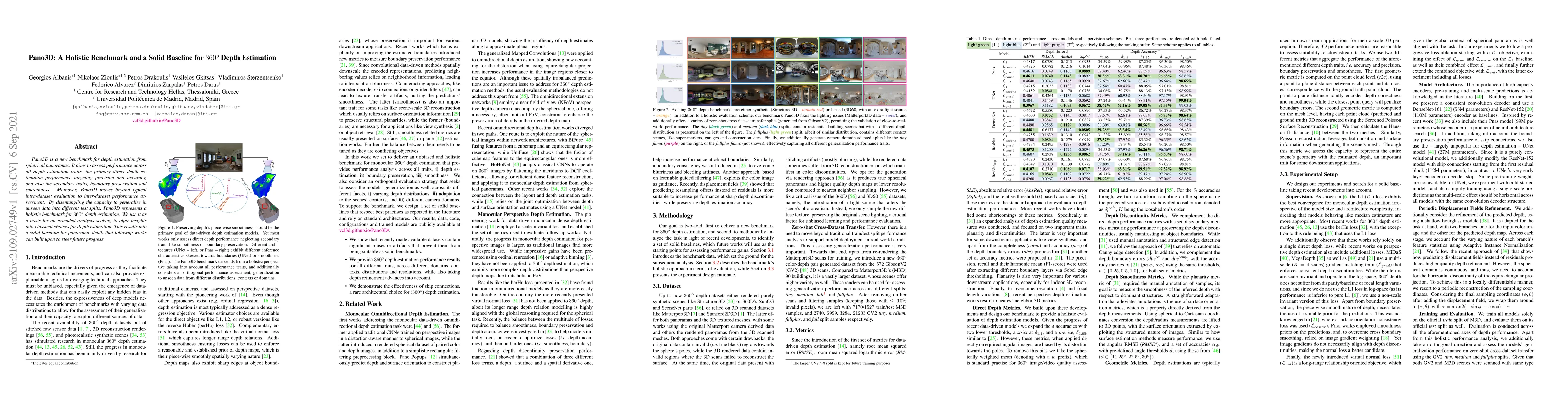 Pano3D is a new benchmark for depth estimation from spherical panoramas. It aims to assess performance across all depth estimation traits, the primary direct depth estimation performance targeting precision and accuracy, and also the secondary traits, boundary preservation, and smoothness. Moreover, Pano3D moves beyond typical intra-dataset evaluation to inter-dataset performance assessment. By disentangling the capacity to generalize to unseen data into different test splits, Pano3D represents a holistic benchmark for $360^o$ depth estimation. We use it as a basis for an extended analysis seeking to offer insights into classical choices for depth estimation. This results in a solid baseline for panoramic depth that follow-up works can build upon to steer future progress.
