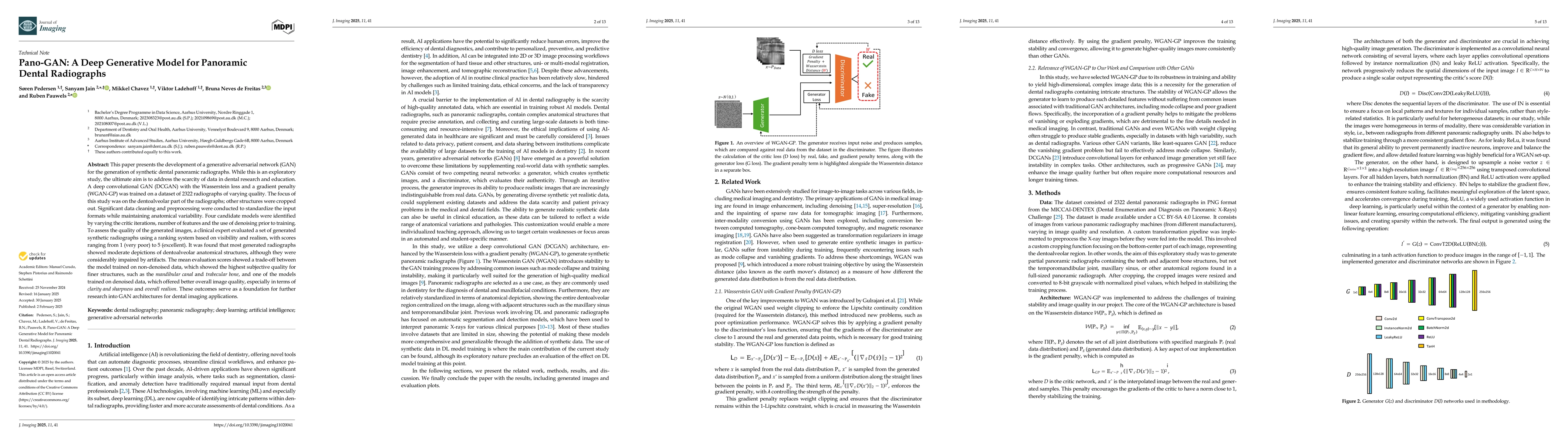 This paper presents the development of a generative adversarial network (GAN) for synthesizing dental panoramic radiographs. Although exploratory in nature, the study aims to address the scarcity of data in dental research and education. We trained a deep convolutional GAN (DCGAN) using a Wasserstein loss with gradient penalty (WGANGP) on a dataset of 2322 radiographs of varying quality. The focus was on the dentoalveolar regions, other anatomical structures were cropped out. Extensive preprocessing and data cleaning were performed to standardize the inputs while preserving anatomical variability. We explored four candidate models by varying critic iterations, feature depth, and the use of denoising prior to training. A clinical expert evaluated the generated radiographs based on anatomical visibility and realism, using a 5-point scale (1 very poor 5 excellent). Most images showed moderate anatomical depiction, although some were degraded by artifacts. A trade-off was observed the model trained on non-denoised data yielded finer details especially in structures like the mandibular canal and trabecular bone, while a model trained on denoised data offered superior overall image clarity and sharpness. These findings provide a foundation for future work on GAN-based methods in dental imaging.