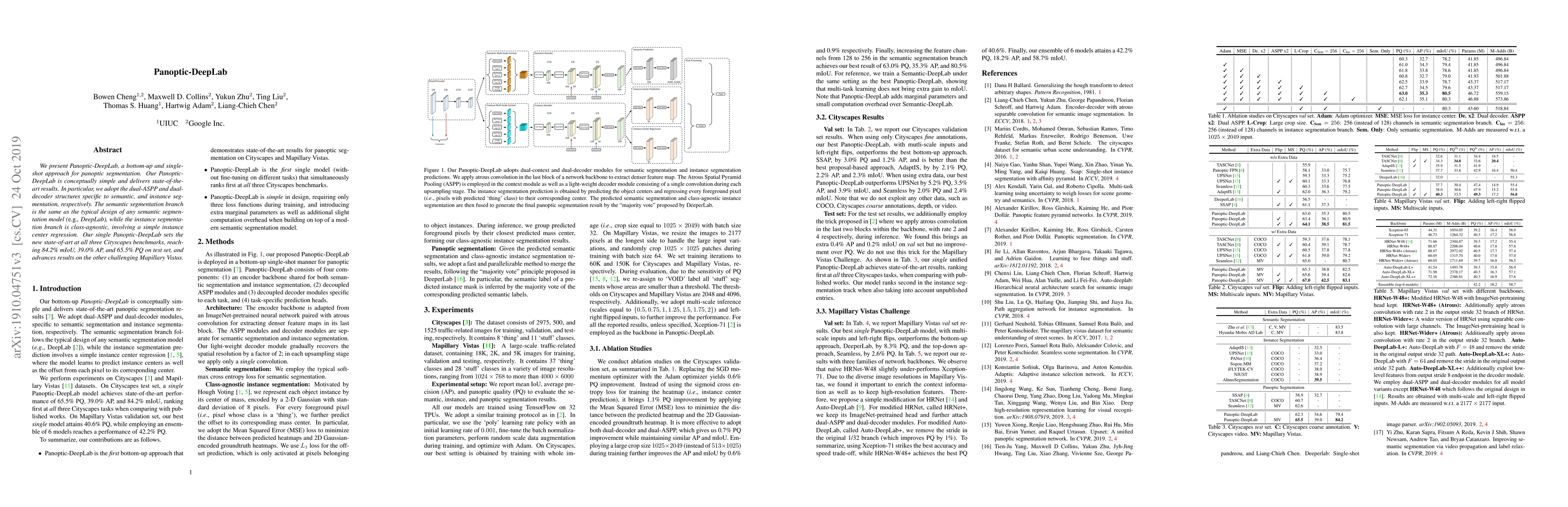 Panoptic-DeepLab introduces a novel approach for panoptic segmentation using a dual-ASPP and dual-decoder structure, achieving state-of-the-art results on Cityscapes benchmarks with an 84.2% mIoU, 39.0% AP, and 65.5% PQ. The method combines semantic and class-agnostic instance segmentation in a single model.