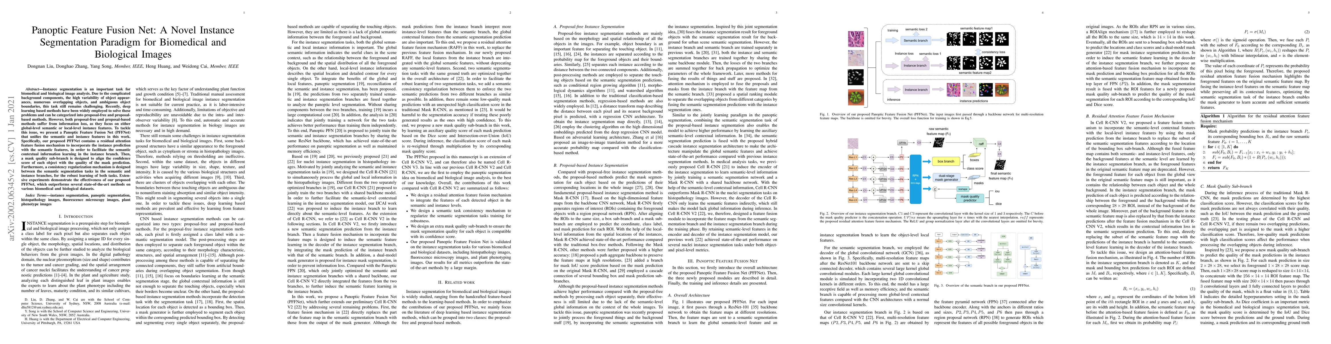 Instance segmentation is an important task for biomedical and biological image analysis. Due to the complicated background components, the high variability of object appearances, numerous overlapping objects, and ambiguous object boundaries, this task still remains challenging. Recently, deep learning based methods have been widely employed to solve these problems and can be categorized into proposal-free and proposal-based methods. However, both proposal-free and proposal-based methods suffer from information loss, as they focus on either global-level semantic or local-level instance features. To tackle this issue, we present a Panoptic Feature Fusion Net (PFFNet) that unifies the semantic and instance features in this work. Specifically, our proposed PFFNet contains a residual attention feature fusion mechanism to incorporate the instance prediction with the semantic features, in order to facilitate the semantic contextual information learning in the instance branch. Then, a mask quality sub-branch is designed to align the confidence score of each object with the quality of the mask prediction. Furthermore, a consistency regularization mechanism is designed between the semantic segmentation tasks in the semantic and instance branches, for the robust learning of both tasks. Extensive experiments demonstrate the effectiveness of our proposed PFFNet, which outperforms several state-of-the-art methods on various biomedical and biological datasets.