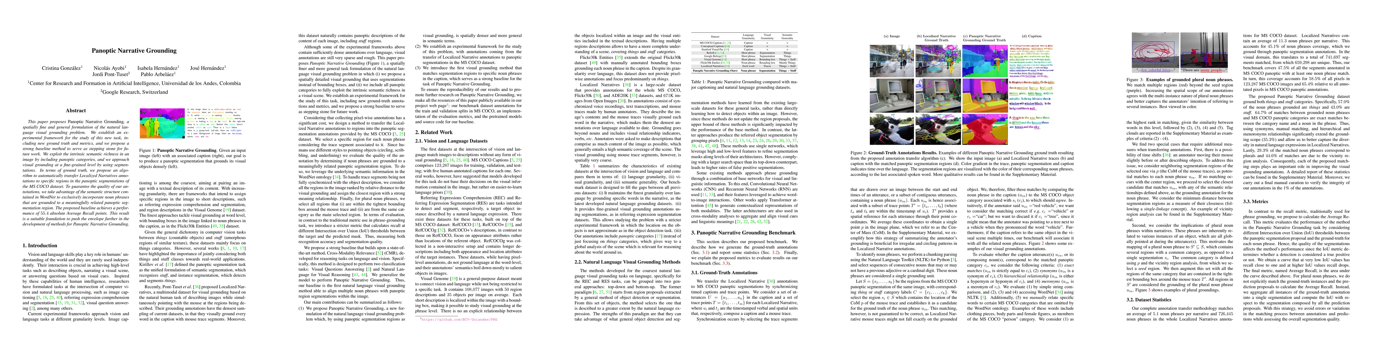 This paper introduces Panoptic Narrative Grounding, a method for spatially fine visual grounding using panoptic categories and segmentations. It establishes a new experimental framework with ground truth annotations and metrics, achieving a baseline performance of 55.4% Average Recall, setting a foundation for future advancements.
