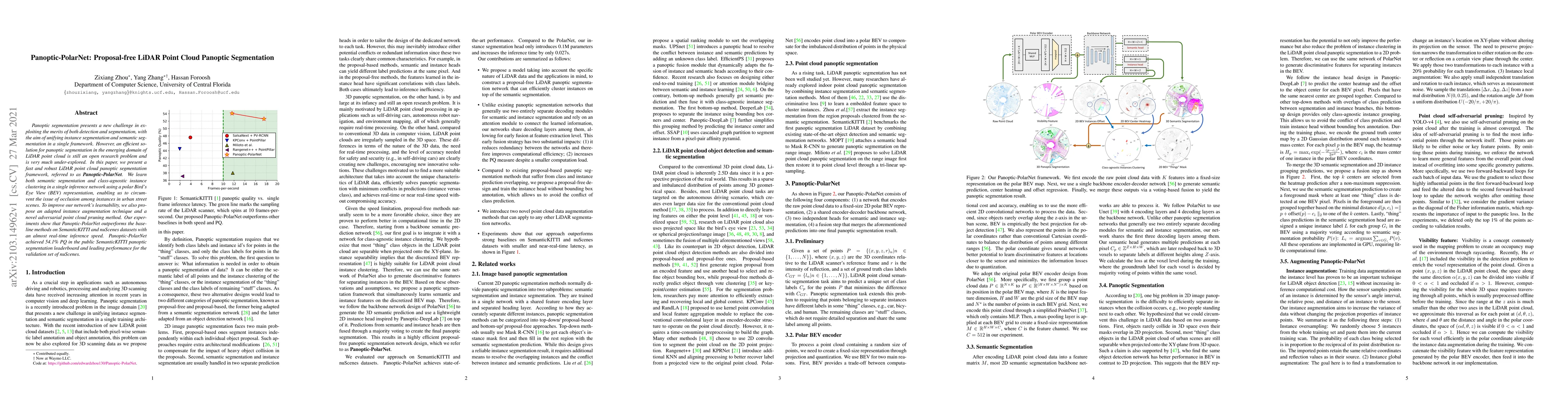 Panoptic-PolarNet presents a proposal-free LiDAR point cloud panoptic segmentation framework that unifies instance and semantic segmentation using a polar BEV representation. The method achieves superior performance on SemanticKITTI and nuScenes datasets, demonstrating almost real-time inference speed and leading results in panoptic quality metrics.