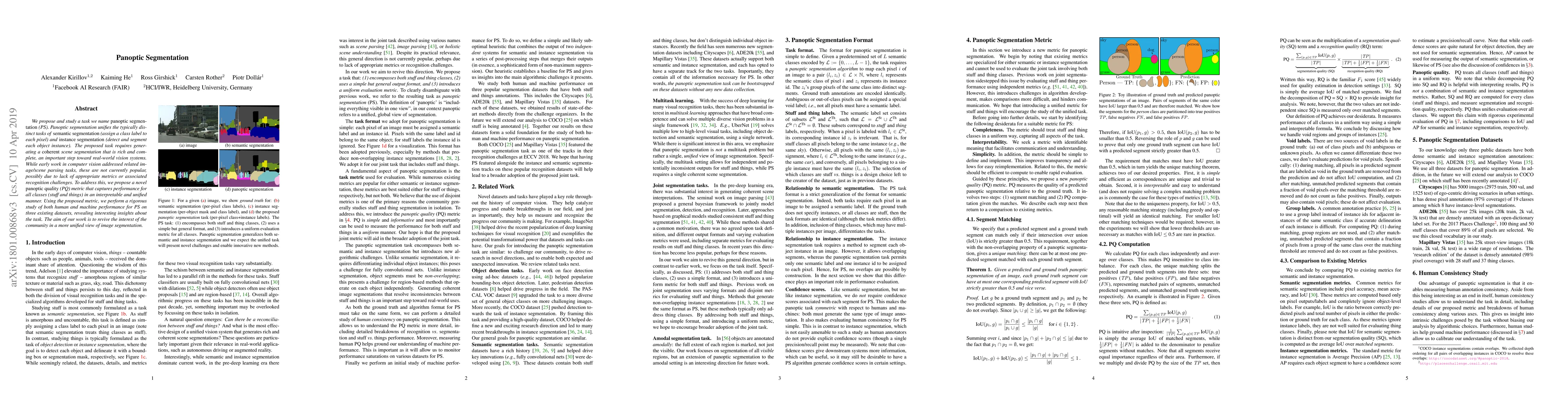 We propose and study a task we name panoptic segmentation (PS). Panoptic segmentation unifies the typically distinct tasks of semantic segmentation (assign a class label to each pixel) and instance segmentation (detect and segment each object instance). The proposed task requires generating a coherent scene segmentation that is rich and complete, an important step toward real-world vision systems. While early work in computer vision addressed related image/scene parsing tasks, these are not currently popular, possibly due to lack of appropriate metrics or associated recognition challenges. To address this, we propose a novel panoptic quality (PQ) metric that captures performance for all classes (stuff and things) in an interpretable and unified manner. Using the proposed metric, we perform a rigorous study of both human and machine performance for PS on three existing datasets, revealing interesting insights about the task. The aim of our work is to revive the interest of the community in a more unified view of image segmentation.