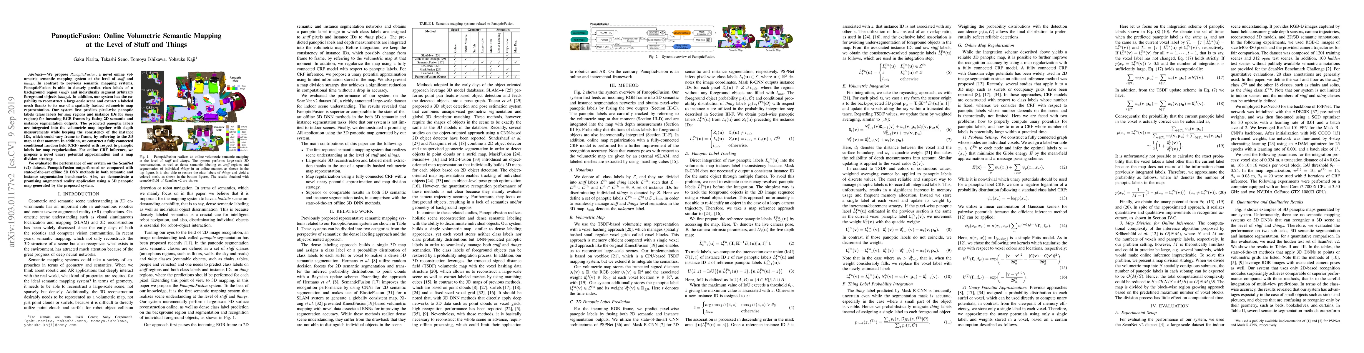 PanopticFusion is an online volumetric semantic mapping system that distinguishes between background regions (stuff) and individual objects (things) with dense predictions and segmentation. It reconstructs large-scale scenes and generates a labeled mesh using a spatially hashed volumetric map, outperforming state-of-the-art methods on ScanNet (v2) dataset.
