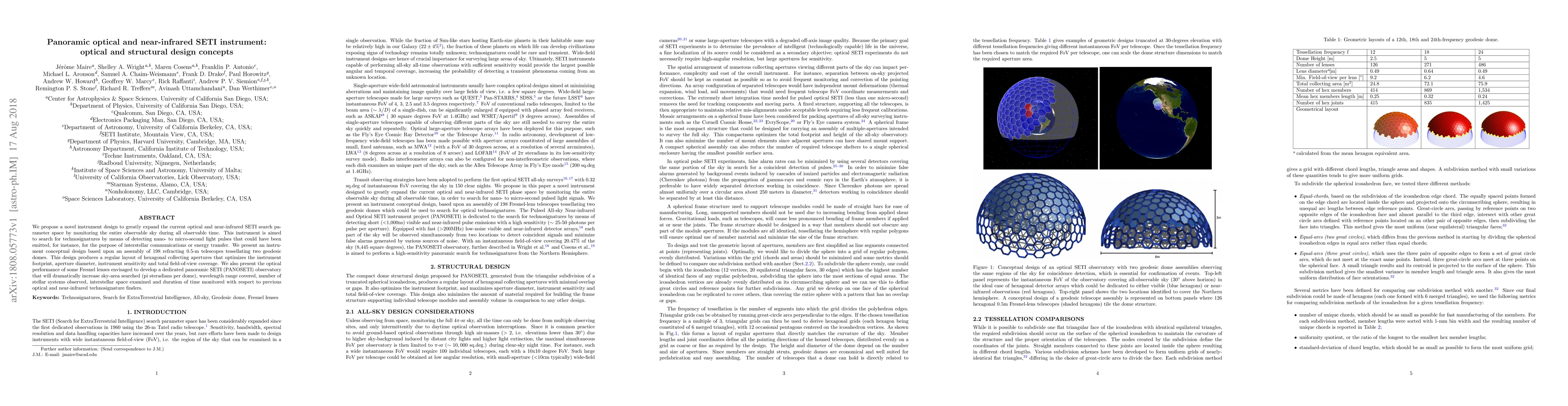 We propose a novel instrument design to greatly expand the current optical and near-infrared SETI search parameter space by monitoring the entire observable sky during all observable time. This instrument is aimed to search for technosignatures by means of detecting nano- to micro-second light pulses that could have been emitted, for instance, for the purpose of interstellar communications or energy transfer. We present an instrument conceptual design based upon an assembly of 198 refracting 0.5-m telescopes tessellating two geodesic domes. This design produces a regular layout of hexagonal collecting apertures that optimizes the instrument footprint, aperture diameter, instrument sensitivity and total field-of-view coverage. We also present the optical performance of some Fresnel lenses envisaged to develop a dedicated panoramic SETI (PANOSETI) observatory that will dramatically increase sky-area searched (pi steradians per dome), wavelength range covered, number of stellar systems observed, interstellar space examined and duration of time monitored with respect to previous optical and near-infrared technosignature finders.