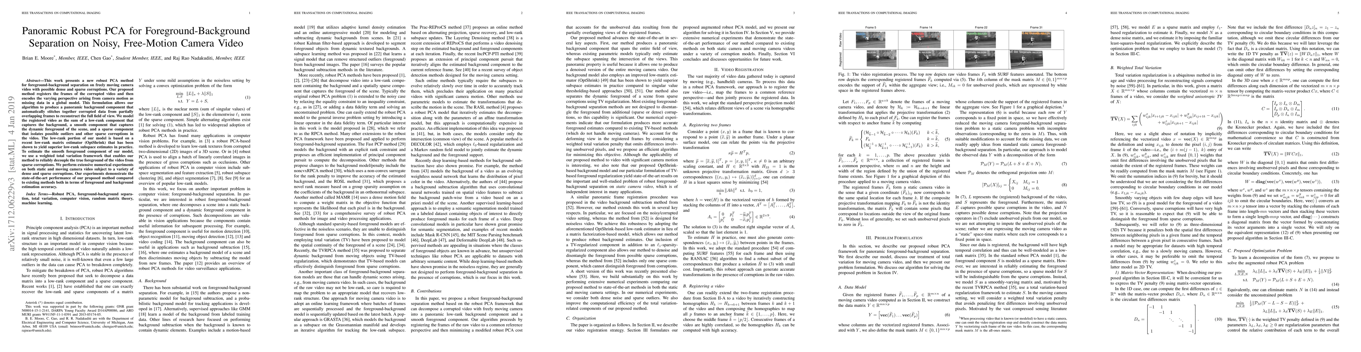 This paper introduces a robust PCA method for separating foreground from background in videos captured by freely moving cameras, handling dense and sparse corruptions. The method leverages a panoramic model to reconstruct the full field of view by stitching together corrupted data from overlapping frames, achieving state-of-the-art performance in foreground and background estimation accuracy.