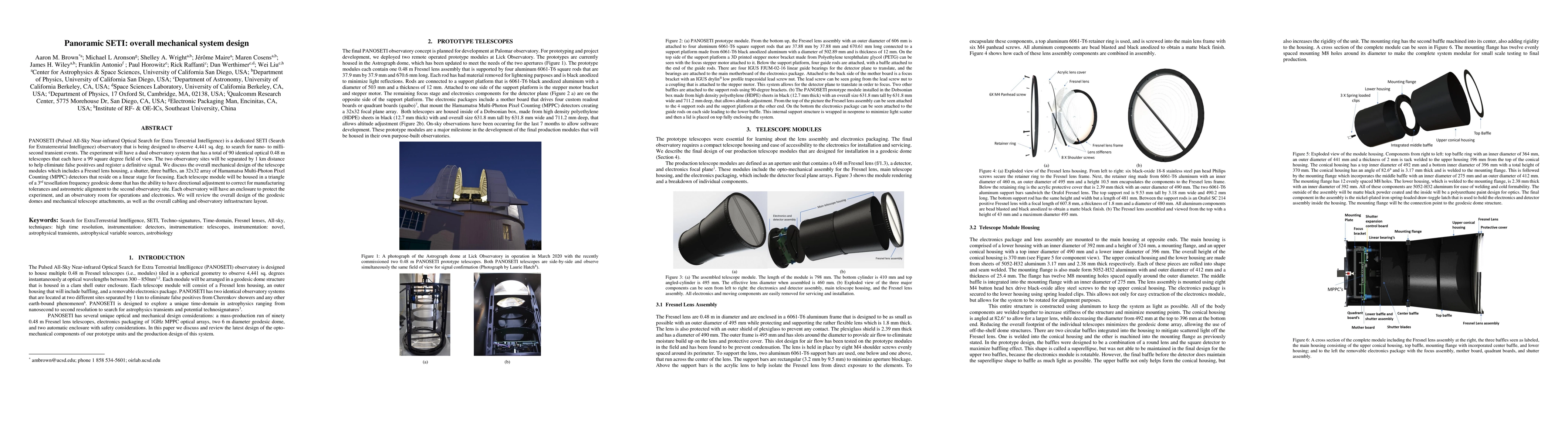 The paper details the mechanical design of PANOSETI, a SETI observatory with 90 identical 0.48m telescopes. The telescopes, featuring Fresnel lenses and MPPC detectors, are housed in geodesic domes with adjustable directionality. The dual observatory setup, separated by 1km, aims to reduce false positives and confirm definitive signals.