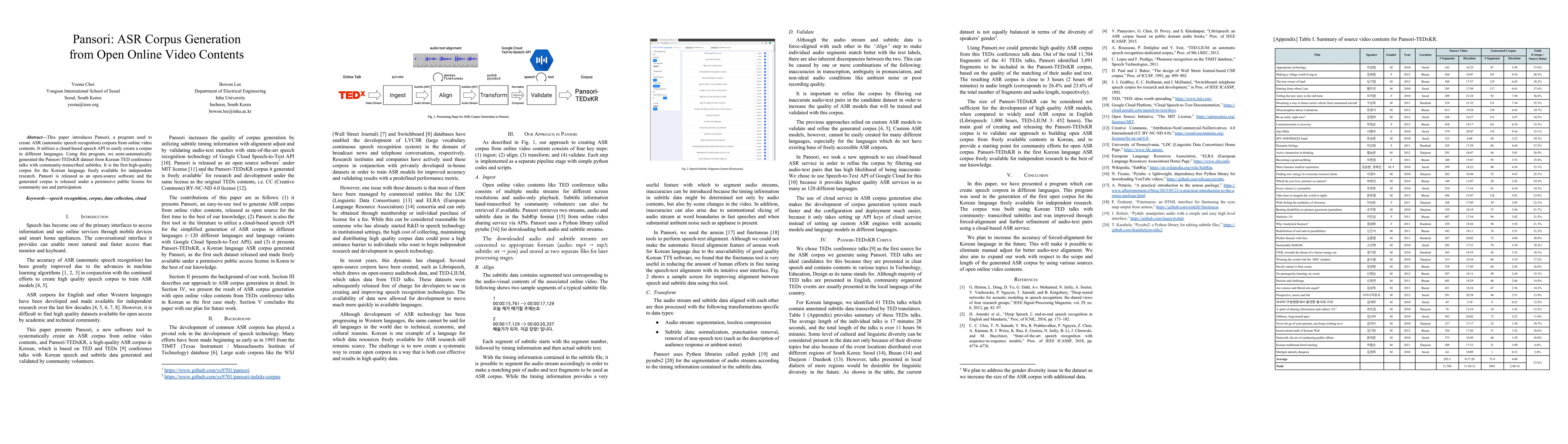 Pansori generates ASR corpora from online video contents using a cloud-based speech API, creating a high-quality Korean language corpus available for independent research. The program is open-source and released under a permissive public license for community use and participation.
