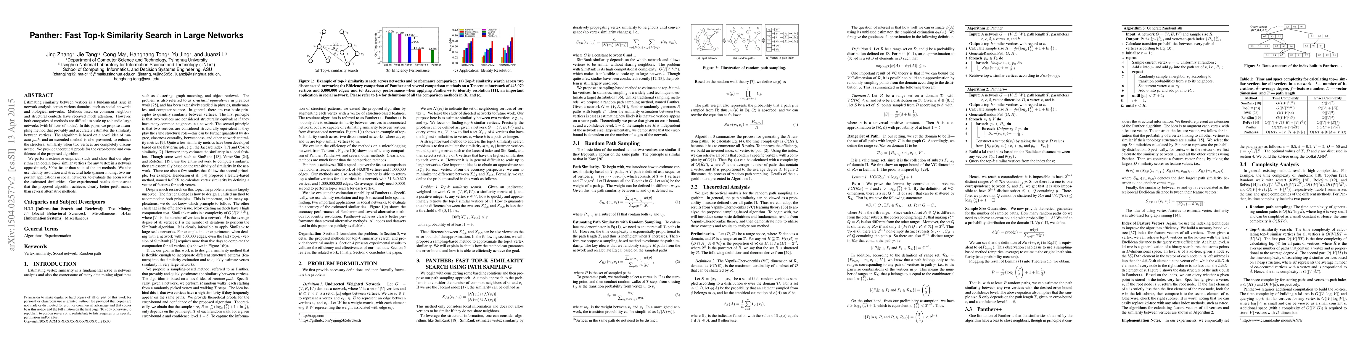 This paper proposes a novel algorithm called Panther that significantly improves similarity search in large networks by estimating vertex similarities approximately 300x faster than existing methods. The algorithm achieves better performance in applications such as social network analysis.