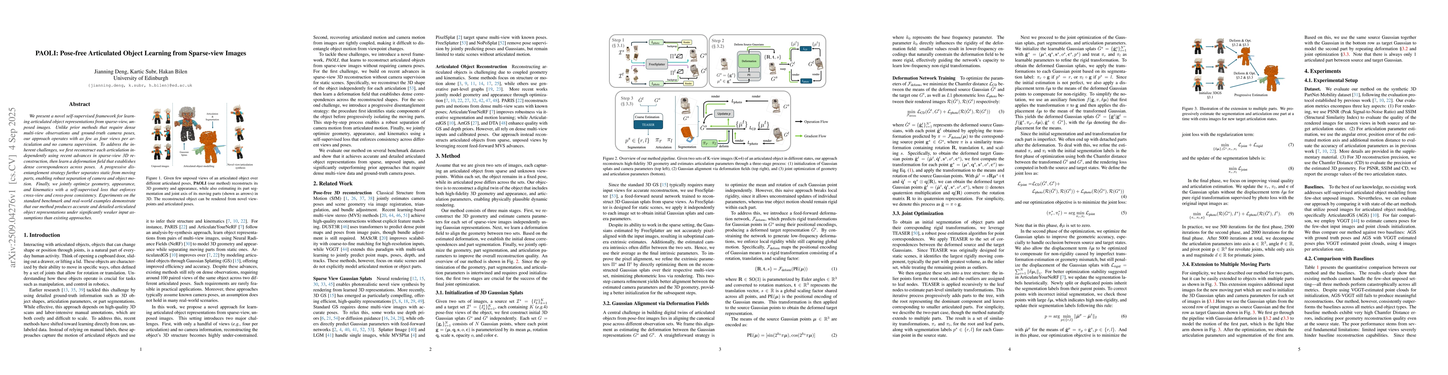 We present a novel self-supervised framework for learning articulated object representations from sparse-view, unposed images. Unlike prior methods that require dense multi-view observations and ground-truth camera poses, our approach operates with as few as four views per articulation and no camera supervision. To address the inherent challenges, we first reconstruct each articulation independently using recent advances in sparse-view 3D reconstruction, then learn a deformation field that establishes dense correspondences across poses. A progressive disentanglement strategy further separates static from moving parts, enabling robust separation of camera and object motion. Finally, we jointly optimize geometry, appearance, and kinematics with a self-supervised loss that enforces cross-view and cross-pose consistency. Experiments on the standard benchmark and real-world examples demonstrate that our method produces accurate and detailed articulated object representations under significantly weaker input assumptions than existing approaches.