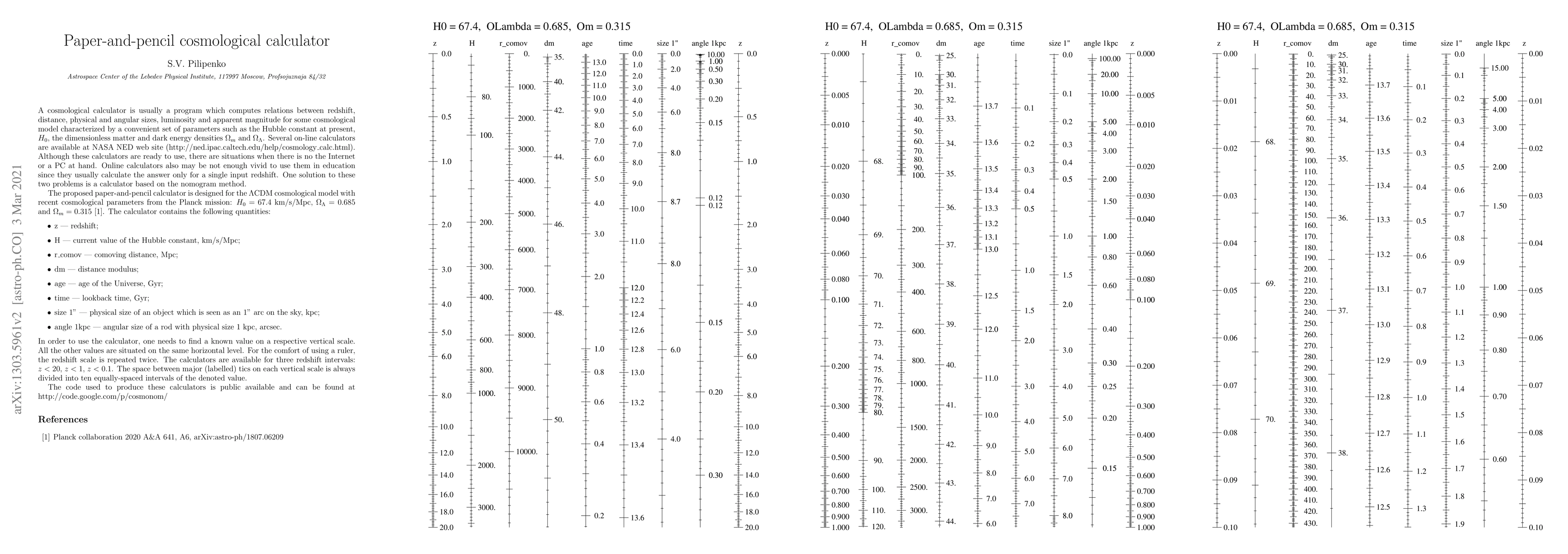 The paper-and-pencil calculator is a cosmological nomogram which allows to find relations between redshift, distance, age of the Universe, physical and angular sizes, luminosity and apparent magnitude for the standard cosmological model with parameters from the Planck mission.