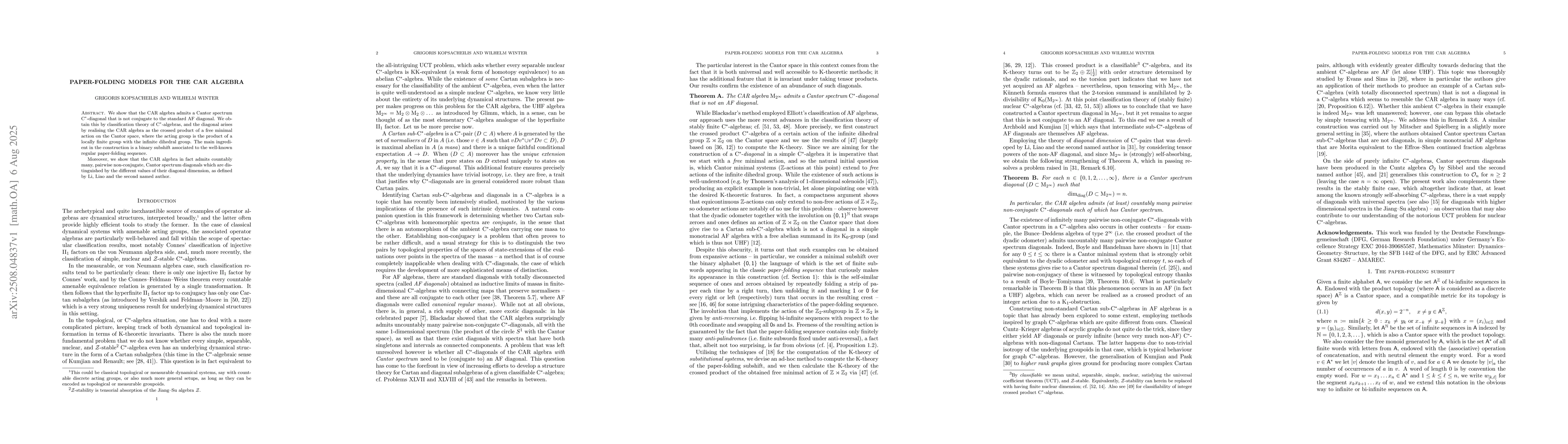 We show that the CAR algebra admits a Cantor spectrum C*-diagonal that is not conjugate to the standard AF diagonal. We obtain this by classification theory of C*-algebras, and the diagonal arises by realising the CAR algebra as the crossed product of a free minimal action on the Cantor space, where the acting group is the product of a locally finite group with the infinite dihedral group. The main ingredient in the construction is a binary subshift associated to the well-known regular paper-folding sequence. Moreover, we show that the CAR algebra in fact admits countably many, pairwise non-conjugate, Cantor spectrum diagonals which are distinguished by the different values of their diagonal dimension, as defined by Li, Liao and the second named author.