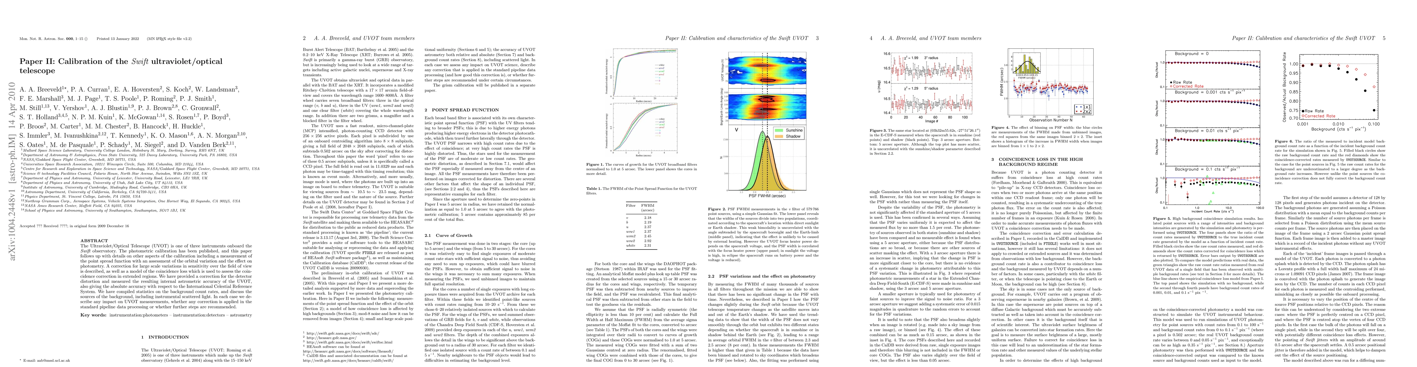 This paper details the comprehensive calibration of the Swift Ultraviolet/Optical Telescope (UVOT), including measurements of the point spread function, correction for large-scale sensitivity variations, and assessment of coincidence loss. It also addresses detector distortion, background count rates, and their impacts on UVOT measurements.
