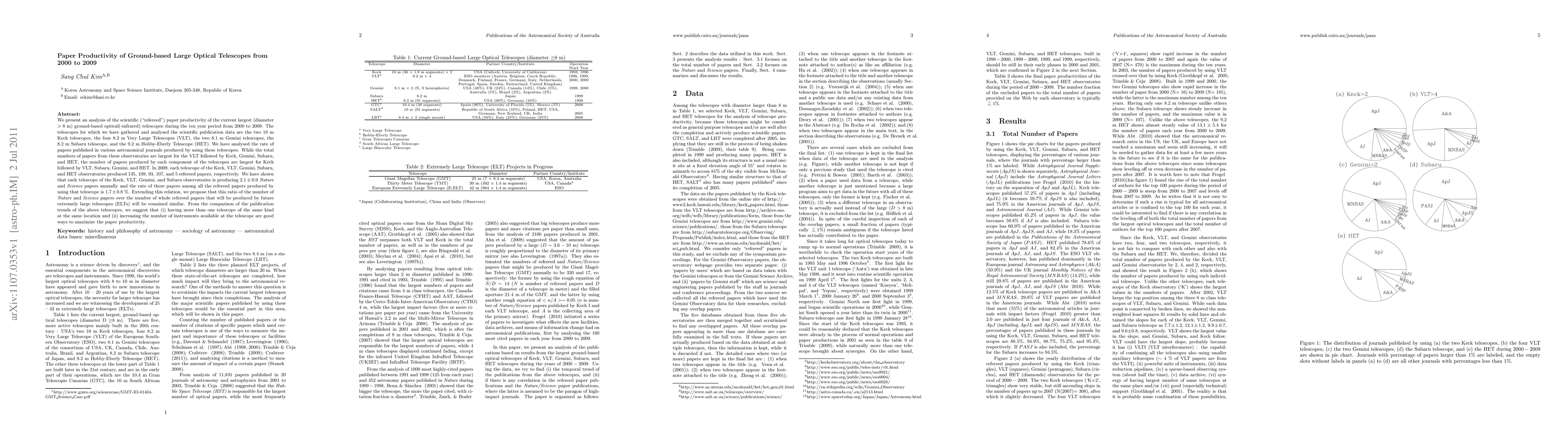 A study analyzed the productivity of 7 large ground-based optical telescopes from 2000 to 2009, finding that Keck produced the most papers, followed by VLT, Gemini, Subaru, and HET. The study suggests that having multiple telescopes at one location and more instruments can maximize paper productivity.