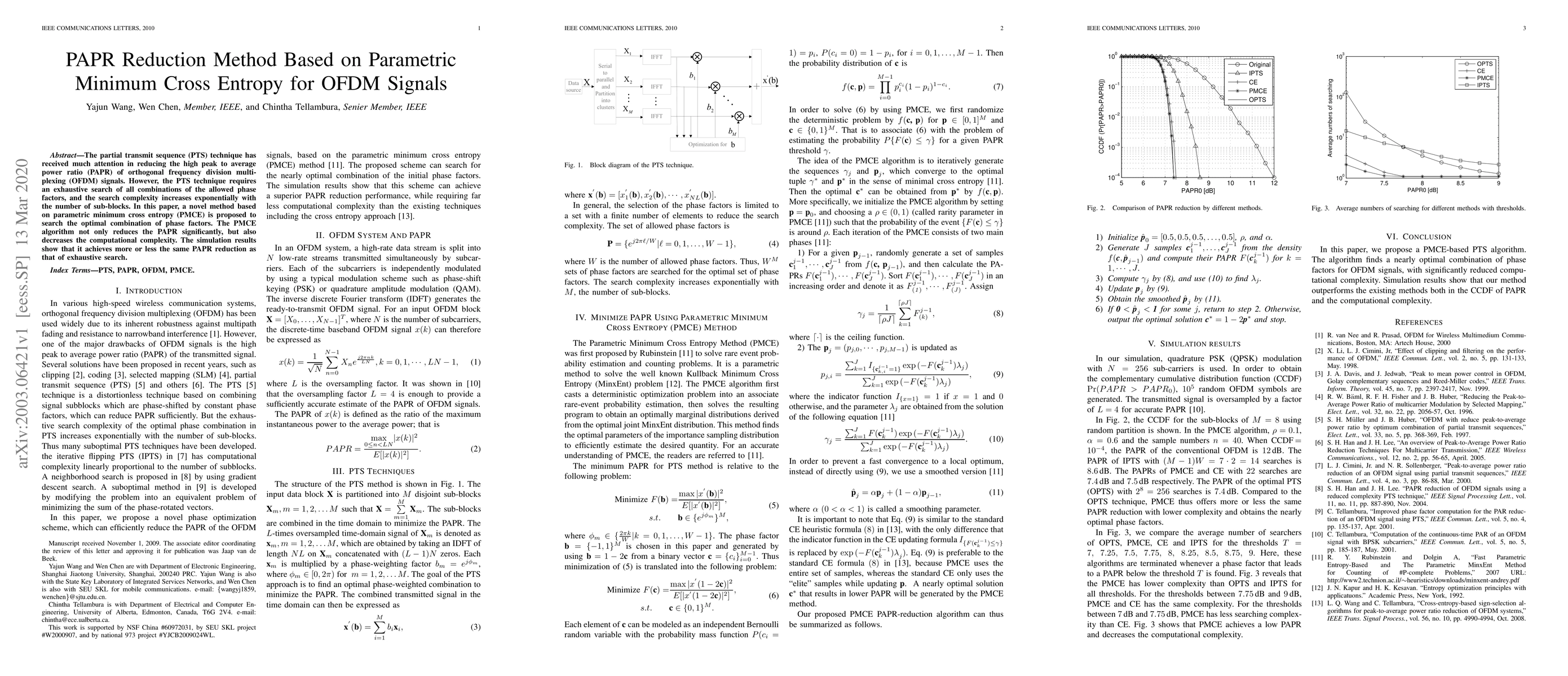 The partial transmit sequence (PTS) technique has received much attention in reducing the high peak to average power ratio (PAPR) of orthogonal frequency division multiplexing (OFDM) signals. However, the PTS technique requires an exhaustive search of all combinations of the allowed phase factors, and the search complexity increases exponentially with the number of sub-blocks. In this paper, a novel method based on parametric minimum cross entropy (PMCE) is proposed to search the optimal combination of phase factors. The PMCE algorithm not only reduces the PAPR significantly, but also decreases the computational complexity. The simulation results show that it achieves more or less the same PAPR reduction as that of exhaustive search.