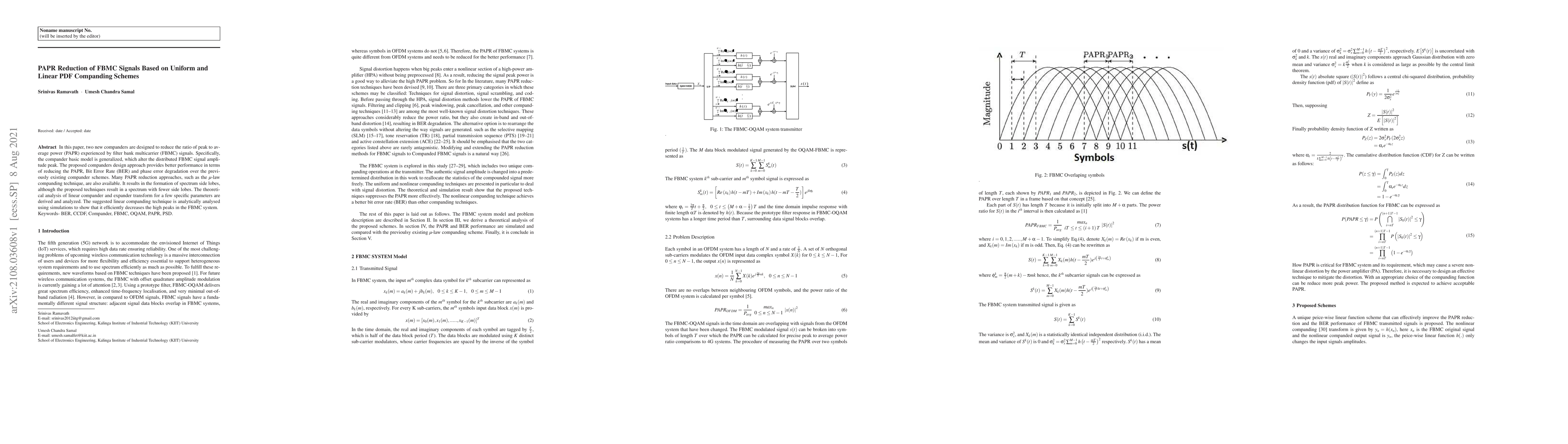 In this paper, two new companders are designed to reduce the ratio of peak to average power (PAPR) experienced by filter bank multicarrier (FBMC) signals. Specifically, the compander basic model is generalized, which alter the distributed FBMC signal amplitude peak. The proposed companders design approach provides better performance in terms of reducing the PAPR, Bit Error Rate (BER) and phase error degradation over the previously existing compander schemes. Many PAPR reduction approaches, such as the Mu-law companding technique, are also available. It results in the formation of spectrum side lobes, although the proposed techniques result in a spectrum with fewer side lobes. The theoretical analysis of linear compander and expander transform for a few specific parameters are derived and analyzed. The suggested linear companding technique is analytically analysed using simulations to show that it efficiently decreases the high peaks in the FBMC system. Keywords- BER, CCDF, Compander, FBMC, OQAM, PAPR, PSD.