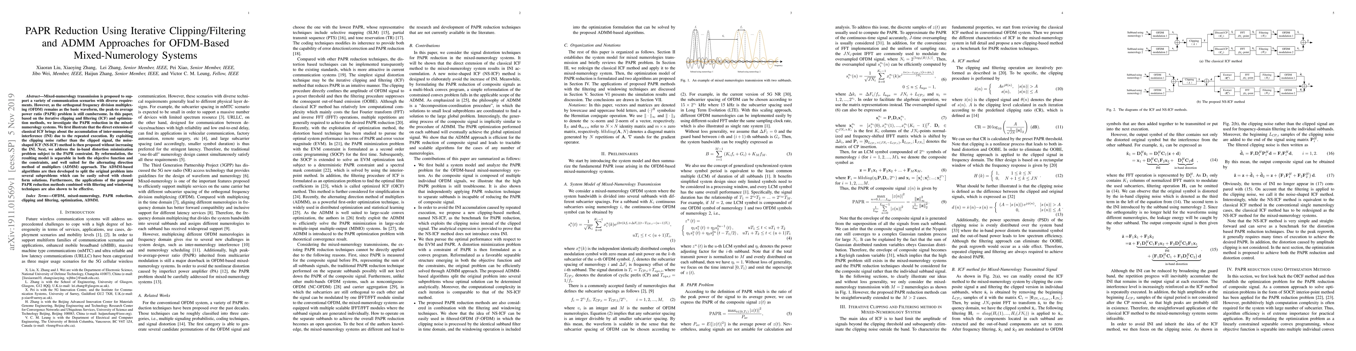 This paper proposes iterative clipping/filtering and ADMM approaches to reduce PAPR in OFDM-based mixed-numerology systems, addressing inter-numerology interference and in-band distortion. The noise-shaped ICF method and ADMM algorithms effectively split the problem into solvable subproblems.