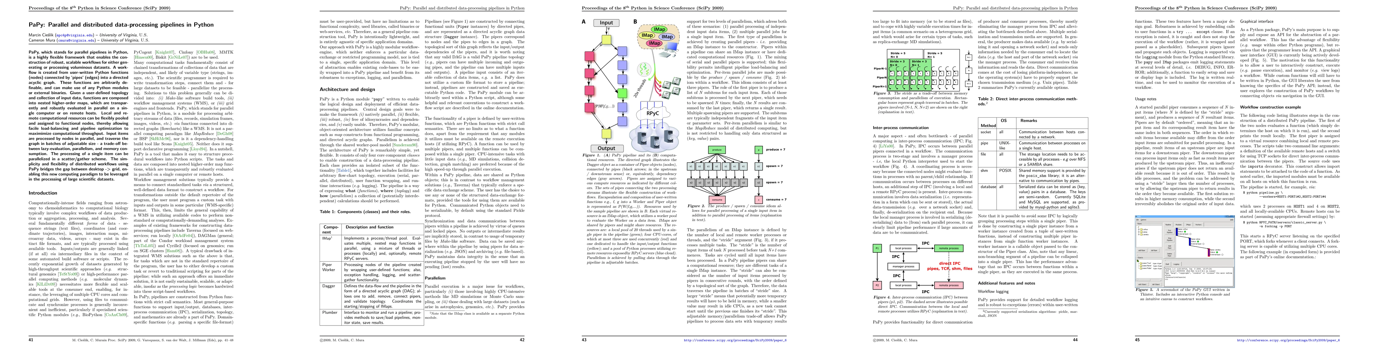 PaPy is a flexible Python framework for creating scalable parallel and distributed data-processing pipelines using Python functions connected in directed acyclic graphs, enabling efficient load-balancing and optimization across local and remote resources. It allows processing large datasets in parallel through adjustable batch sizes and scatter/gather schemes.
