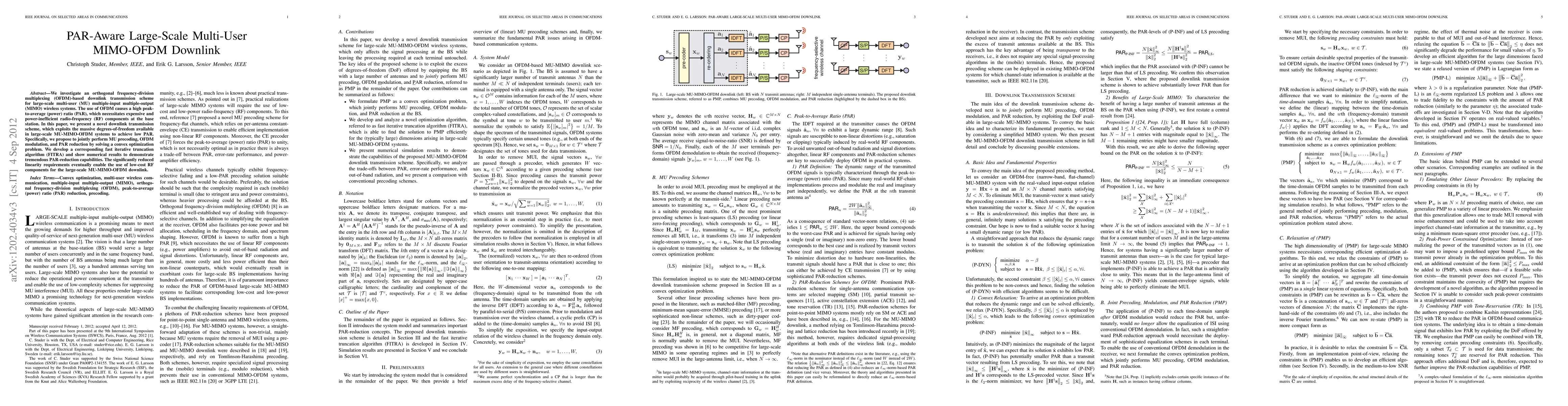 This paper proposes a novel downlink transmission scheme for large-scale multi-user MIMO-OFDM systems that significantly reduces the peak-to-average power ratio (PAR) through joint precoding and modulation optimization, enabling the use of cost-effective RF components. The method employs a fast iterative truncation algorithm to achieve substantial PAR reduction.