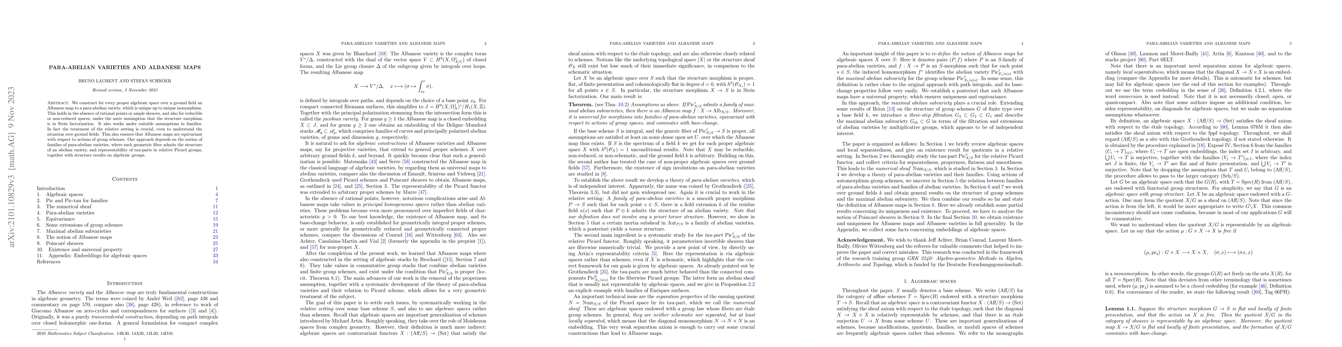 The paper constructs an Albanese map for proper, flat, finite presentation algebraic spaces over a base scheme S, cohomologically flat of degree 0, with h^0(O_X_s) = 1 for all points s in S. This is achieved by defining families of para-abelian varieties and utilizing the notion of families of maximal abelian subvarieties.