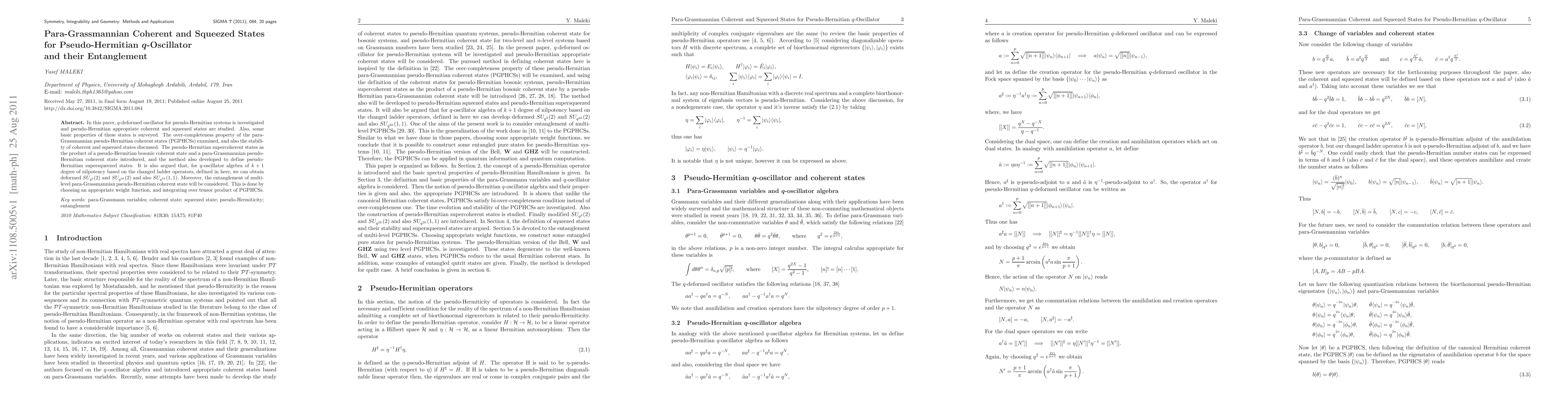 This paper investigates q-deformed oscillators for pseudo-Hermitian systems, introducing para-Grassmannian pseudo-Hermitian coherent and squeezed states. It explores the entanglement properties of multi-level para-Grassmannian pseudo-Hermitian coherent states and discusses the stability and over-completeness of these states.